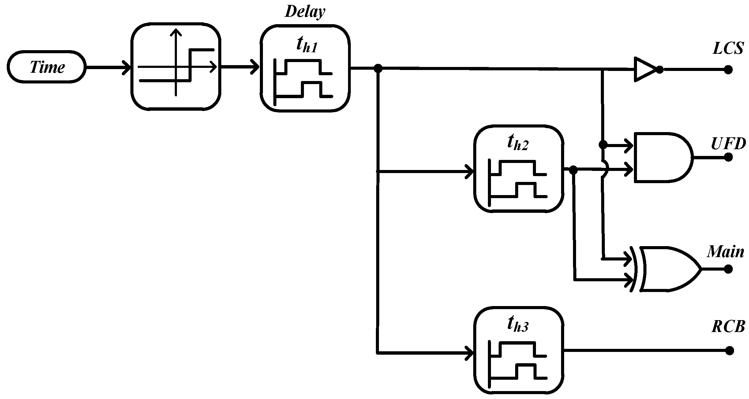 Figure 5 shows control strategy 2 for the hybrid DCCB model, which is based on logical functions. This model incorporates a time delay (