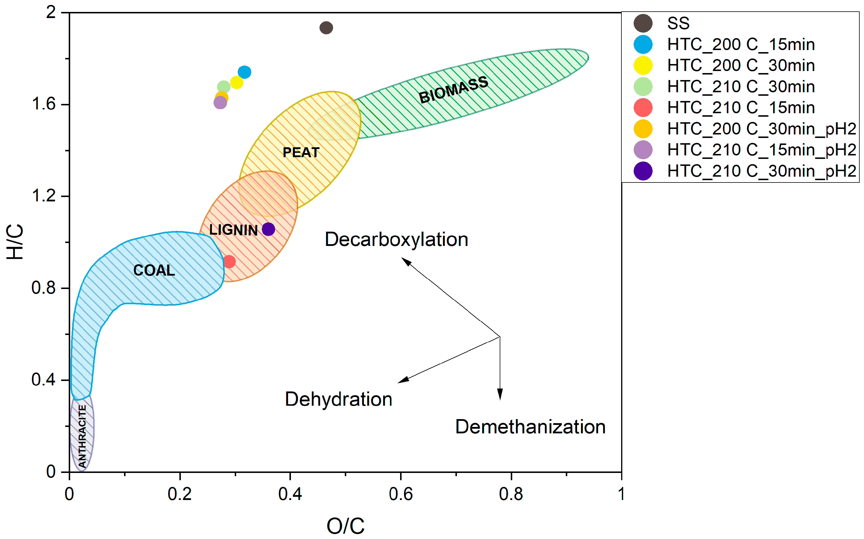 - Liu, X.; Zhai, Y.; Li, S.; Wang, B.; Wang, T.; Liu, Y.; Qiu, Z.; Li, C. Hydrothermal Carbonization of Sewage Sludge: Effect of Feed-Water PH on Hydrochar’s Physicochemical Properties, Organic Component and Thermal Behavior. J. Hazard. Mater. 2020, 388, 122084. [Google Scholar] [CrossRef]
