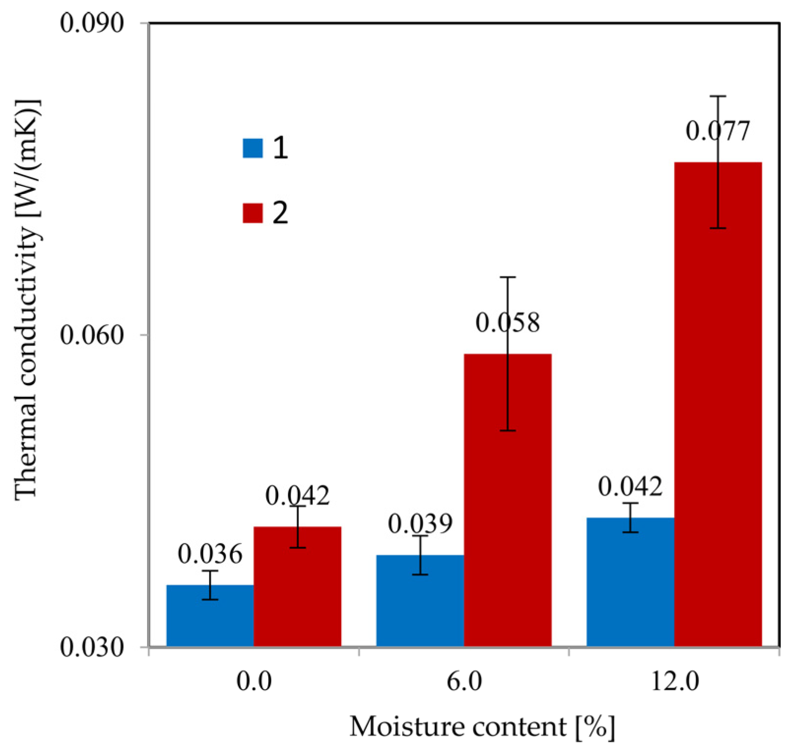 - Gusyachkin, A.; Sabitov, L.; Khakimova, A.; Hayrullin, A. Effects of moisture content on thermal conductivity of thermal insulation materials. IOP Conf. Ser. Mater. Sci. Eng. 2019, 570, 012029. [Google Scholar] [CrossRef]