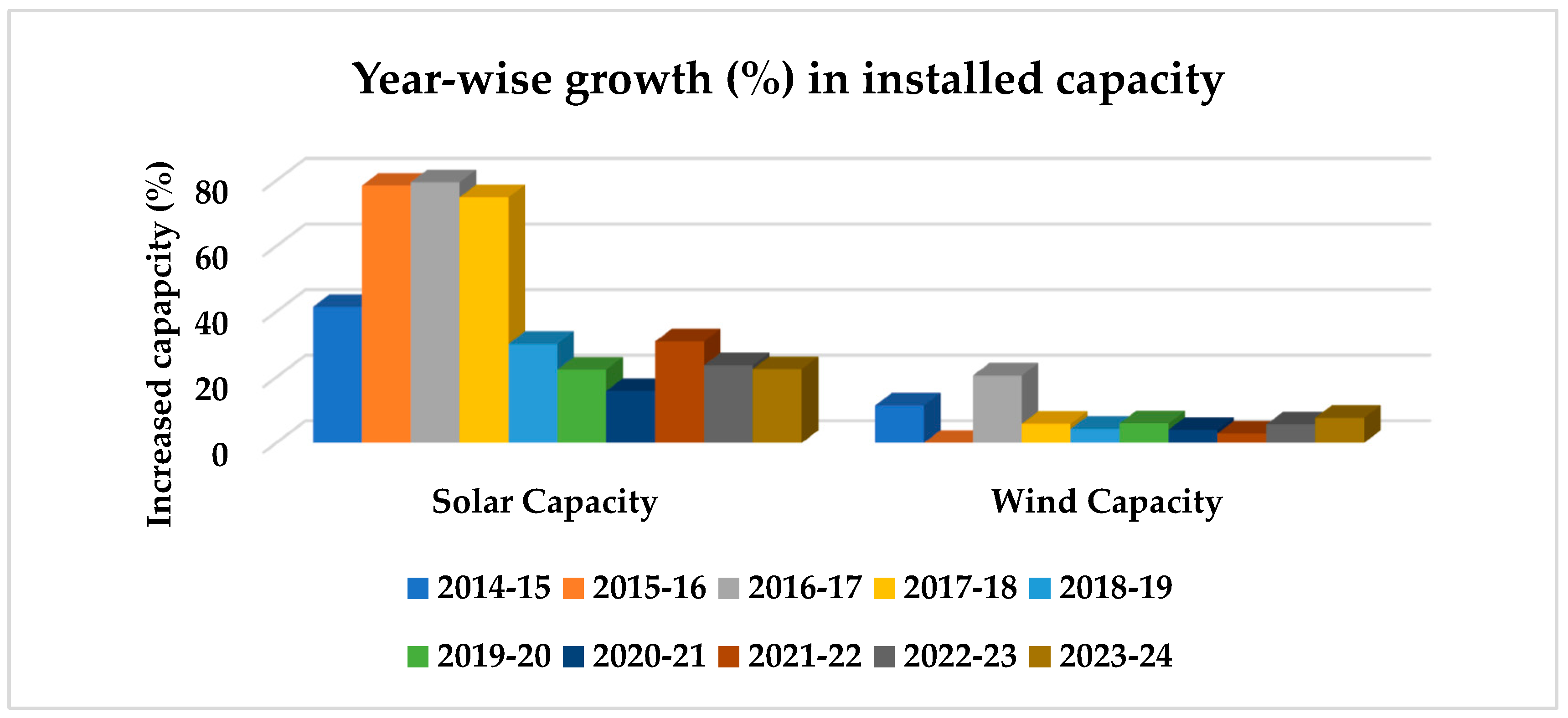 Figure 1 represents the incremental development in solar and wind power installed capacity for the last decade (2014-15 to 2023-24) in India [