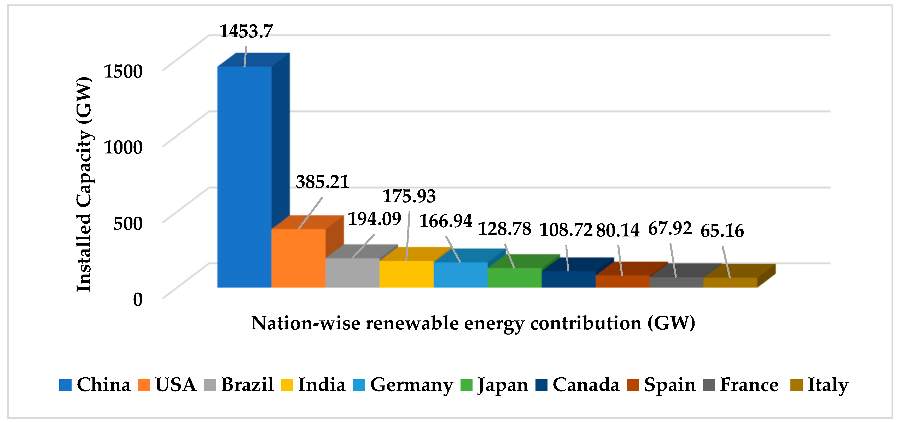 24]. China leads with the highest capacity of 1453.7 GW, whereas India has the fourth-largest installed capacity of renewable energy in world with 175.93 GW. These top ten countries contribute around 73.15% of the total global renewable capacity.