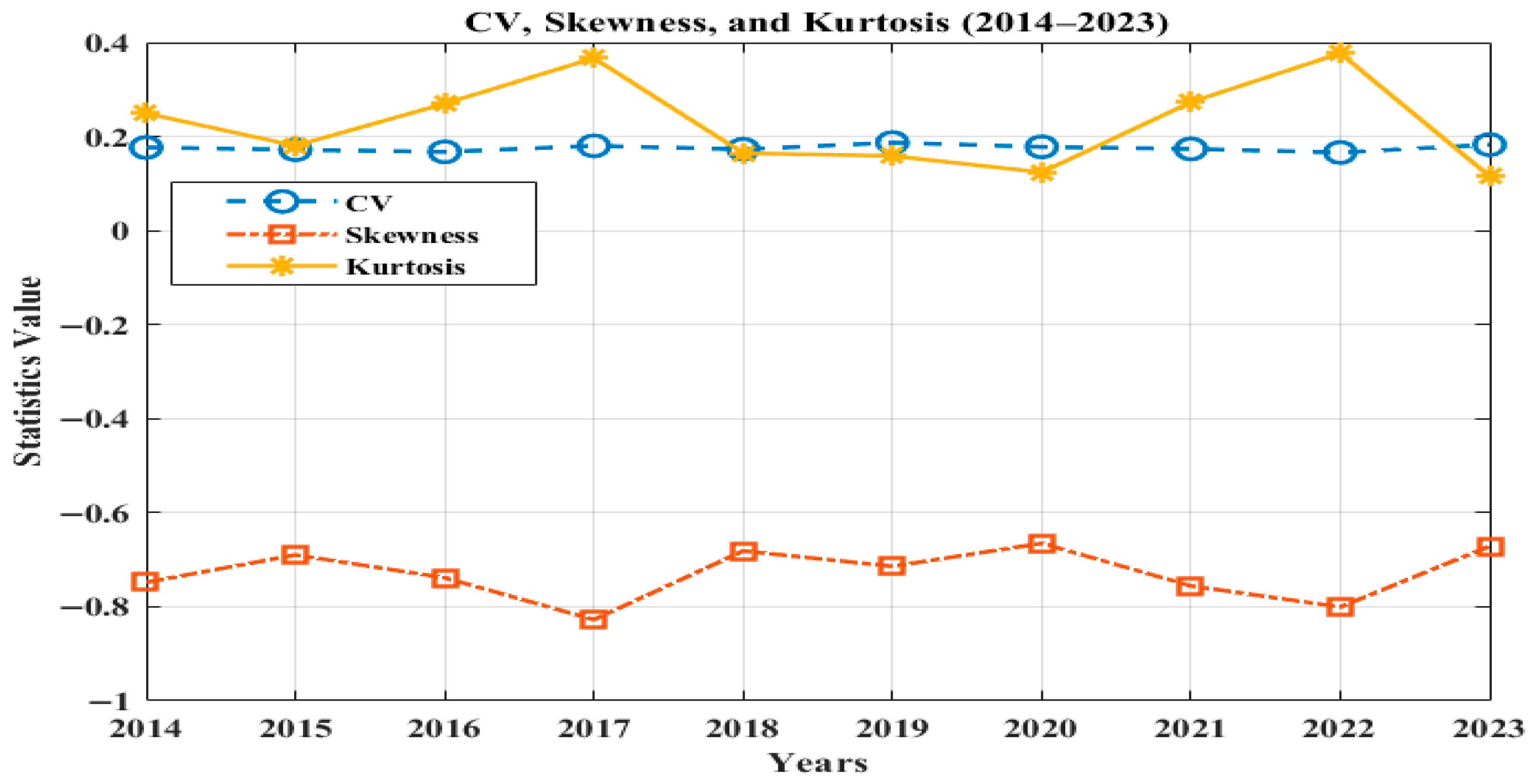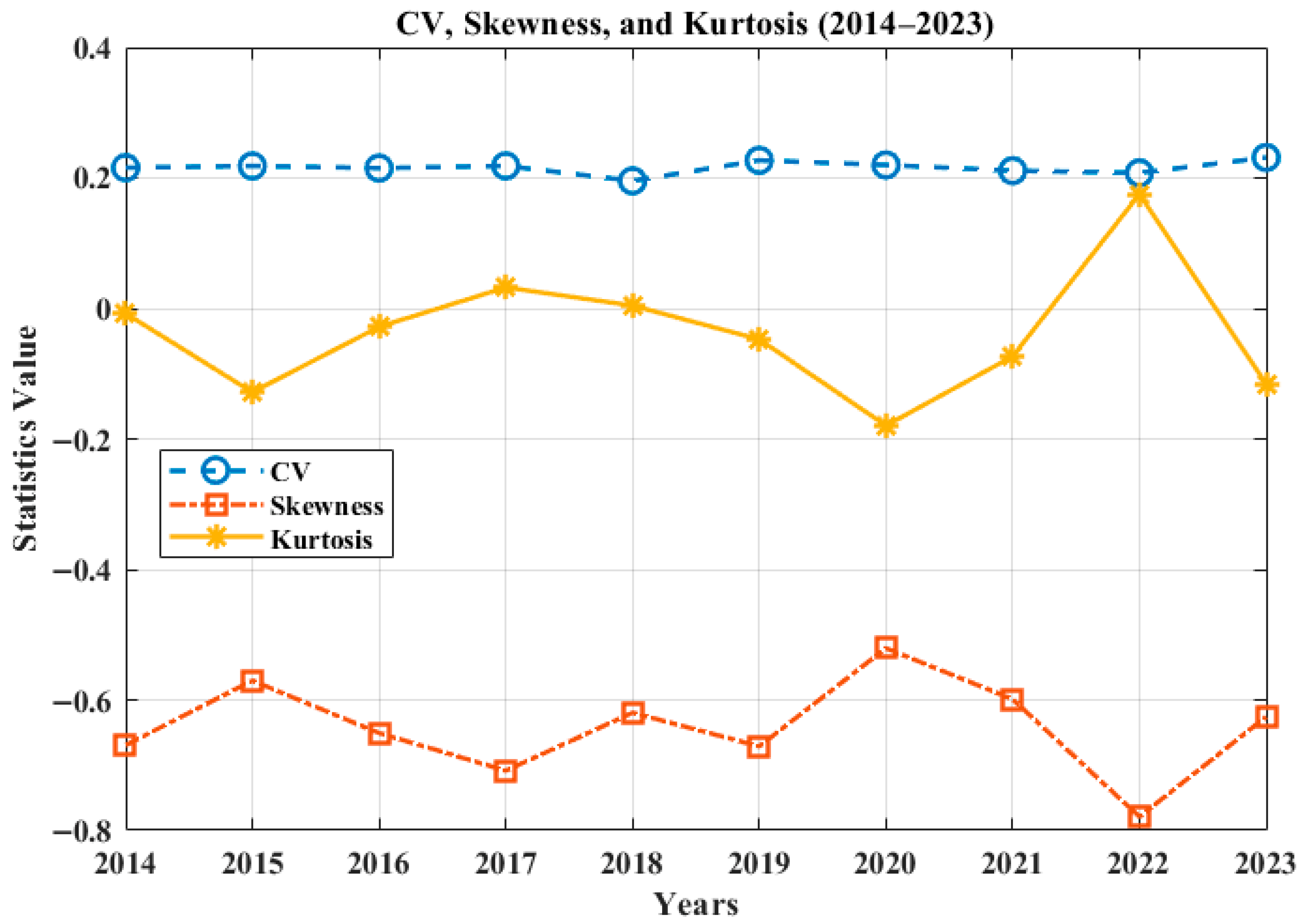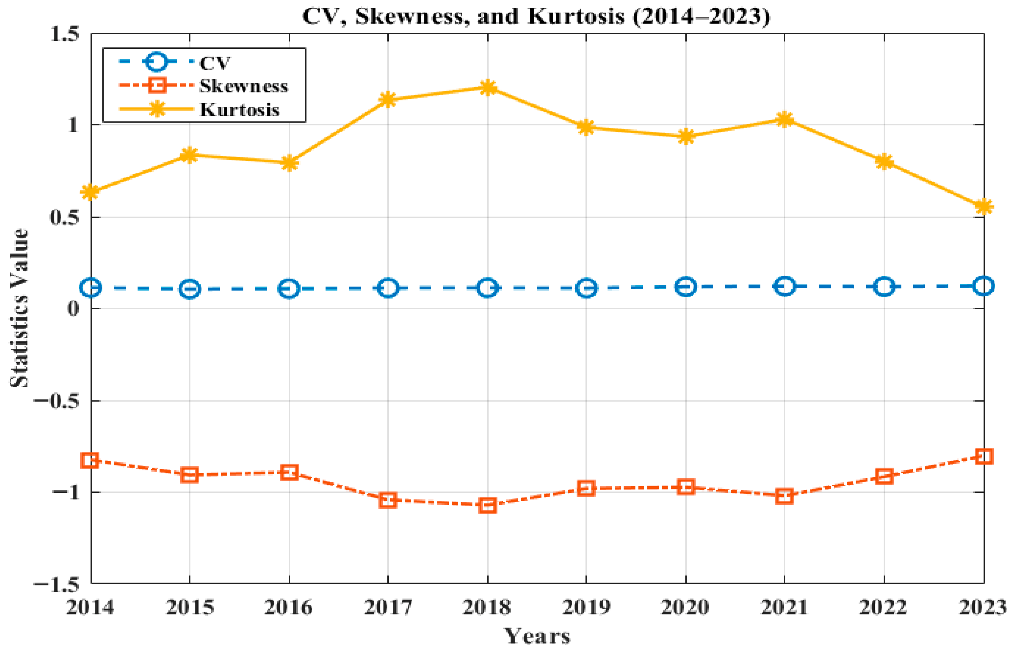 Figure 7, it can be observed that the lowest CV value is 0.0976 for the year 2015 and the lowest average for the whole assessment period is 0.1046 for Site 3. However, Site 2 has a maximum CV of 0.2334 for the year 2023 and a maximum average of 0.2227. From all of the above observations presented tabularly and graphically, it can be observed that Site 3 is a more stable location for solar energy integration than the others due to its higher and more consistent mean solar irradiance with low variation in CV, skewness, and kurtosis.