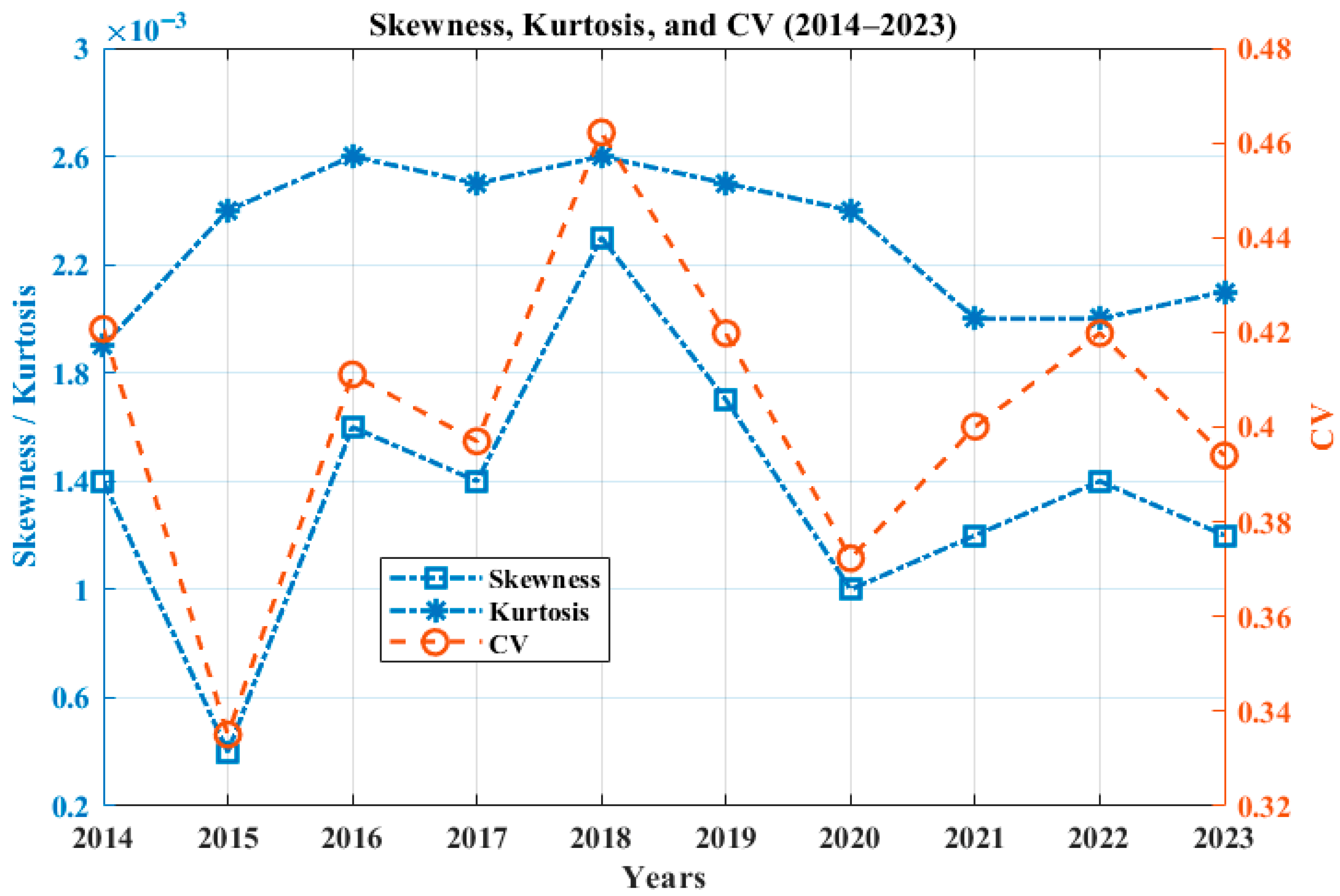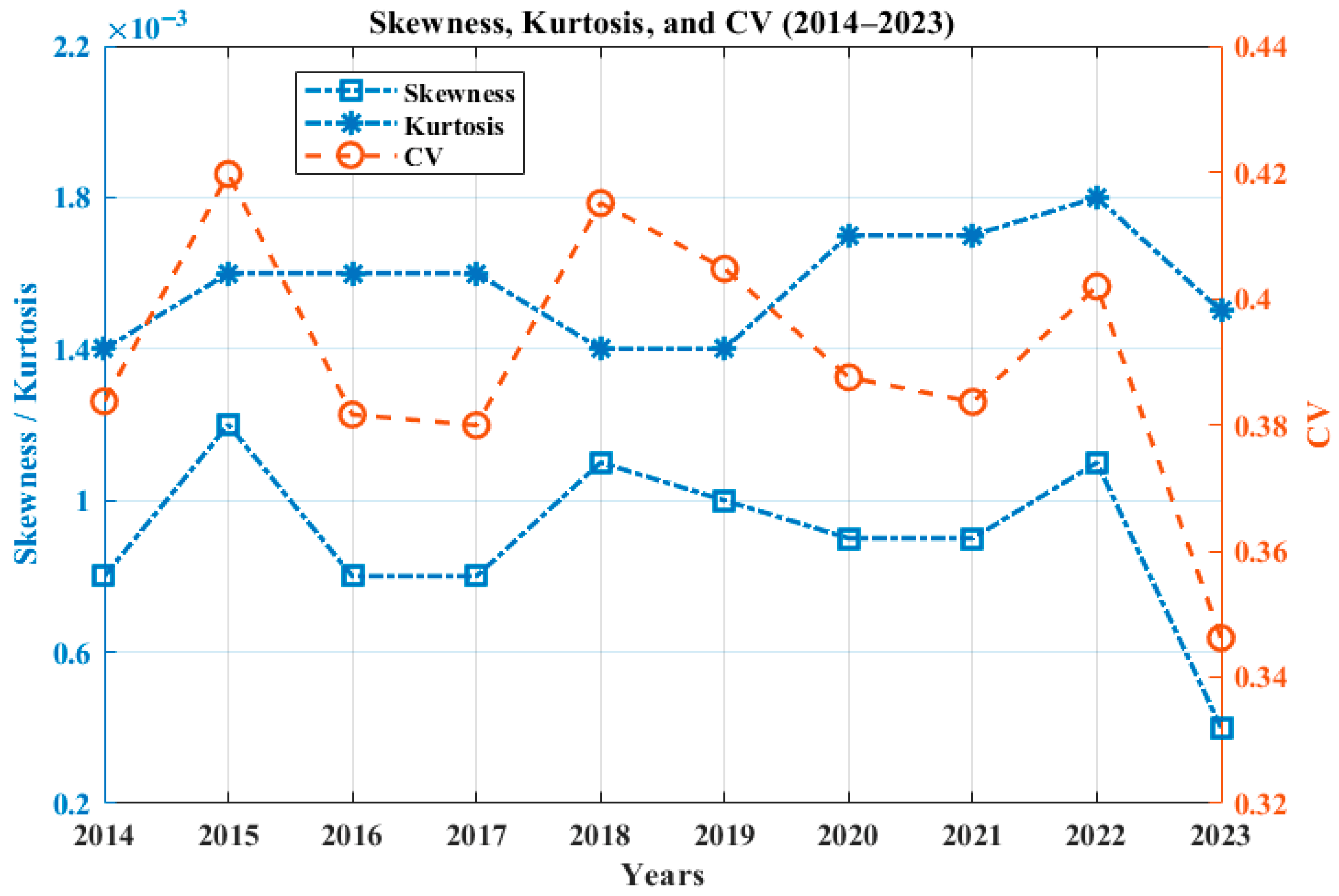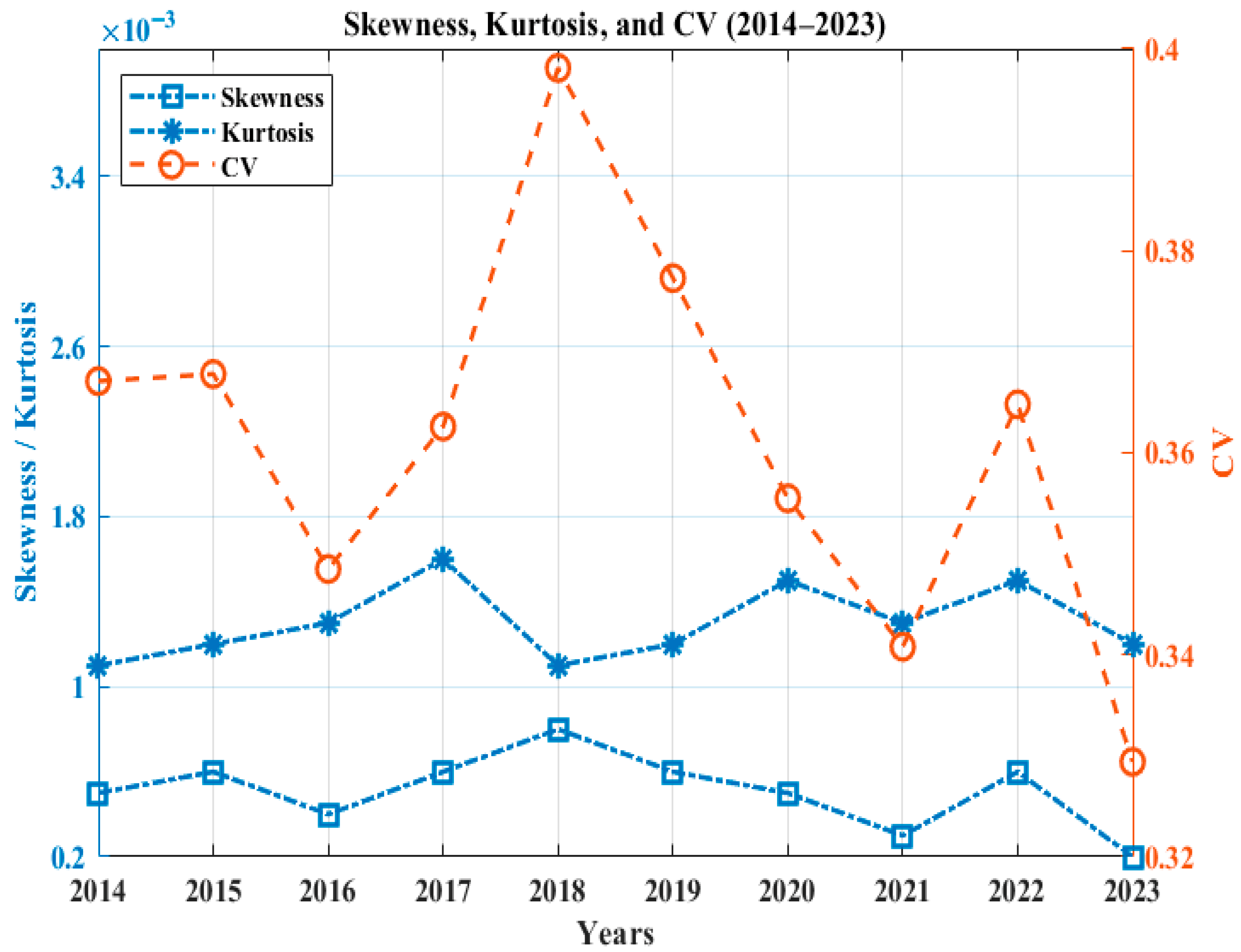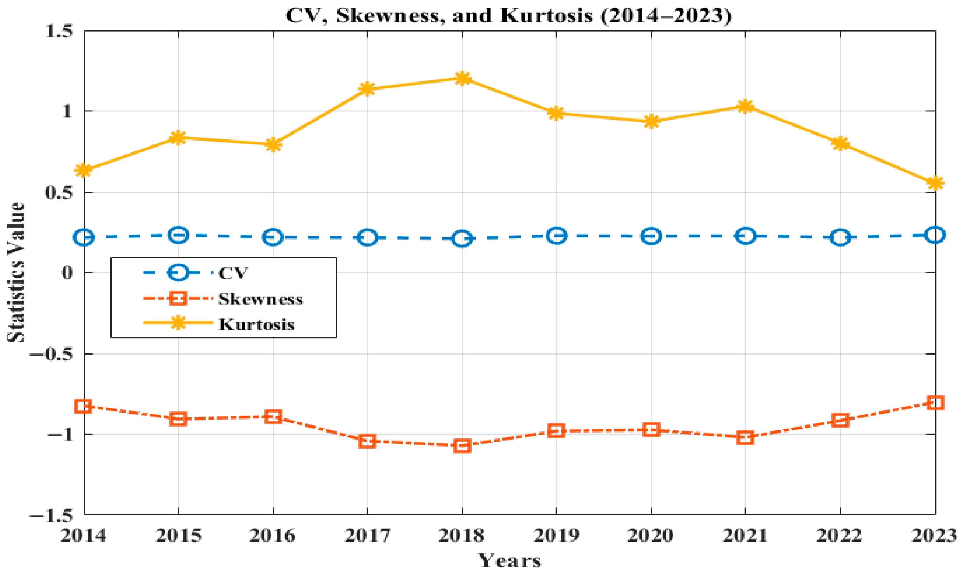 Figure 7, it can be observed that the lowest CV value is 0.0976 for the year 2015 and the lowest average for the whole assessment period is 0.1046 for Site 3. However, Site 2 has a maximum CV of 0.2334 for the year 2023 and a maximum average of 0.2227. From all of the above observations presented tabularly and graphically, it can be observed that Site 3 is a more stable location for solar energy integration than the others due to its higher and more consistent mean solar irradiance with low variation in CV, skewness, and kurtosis.