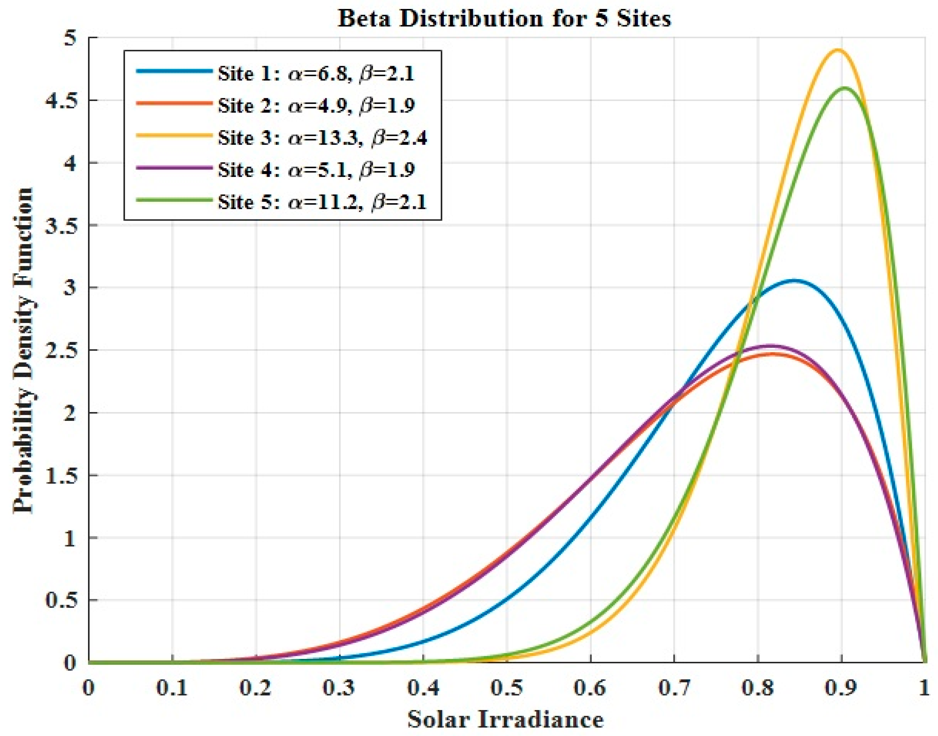 23]. Therefore, among the various probability distribution functions, the Beta PDF (for solar irradiance) and the Weibull PDF (for wind speed) are recognized as the most effective, flexible, and practical choices for probabilistic renewable energy assessments.