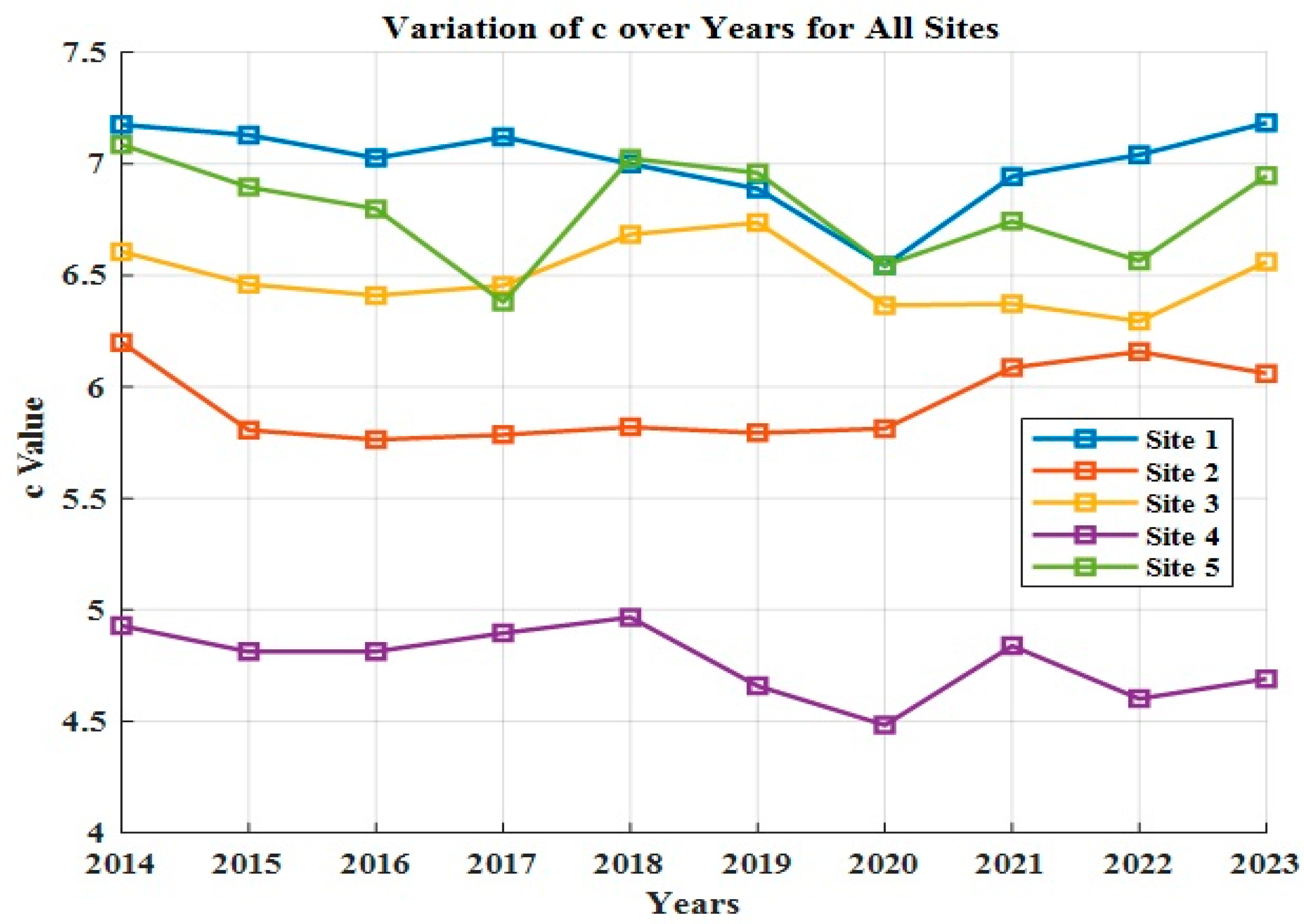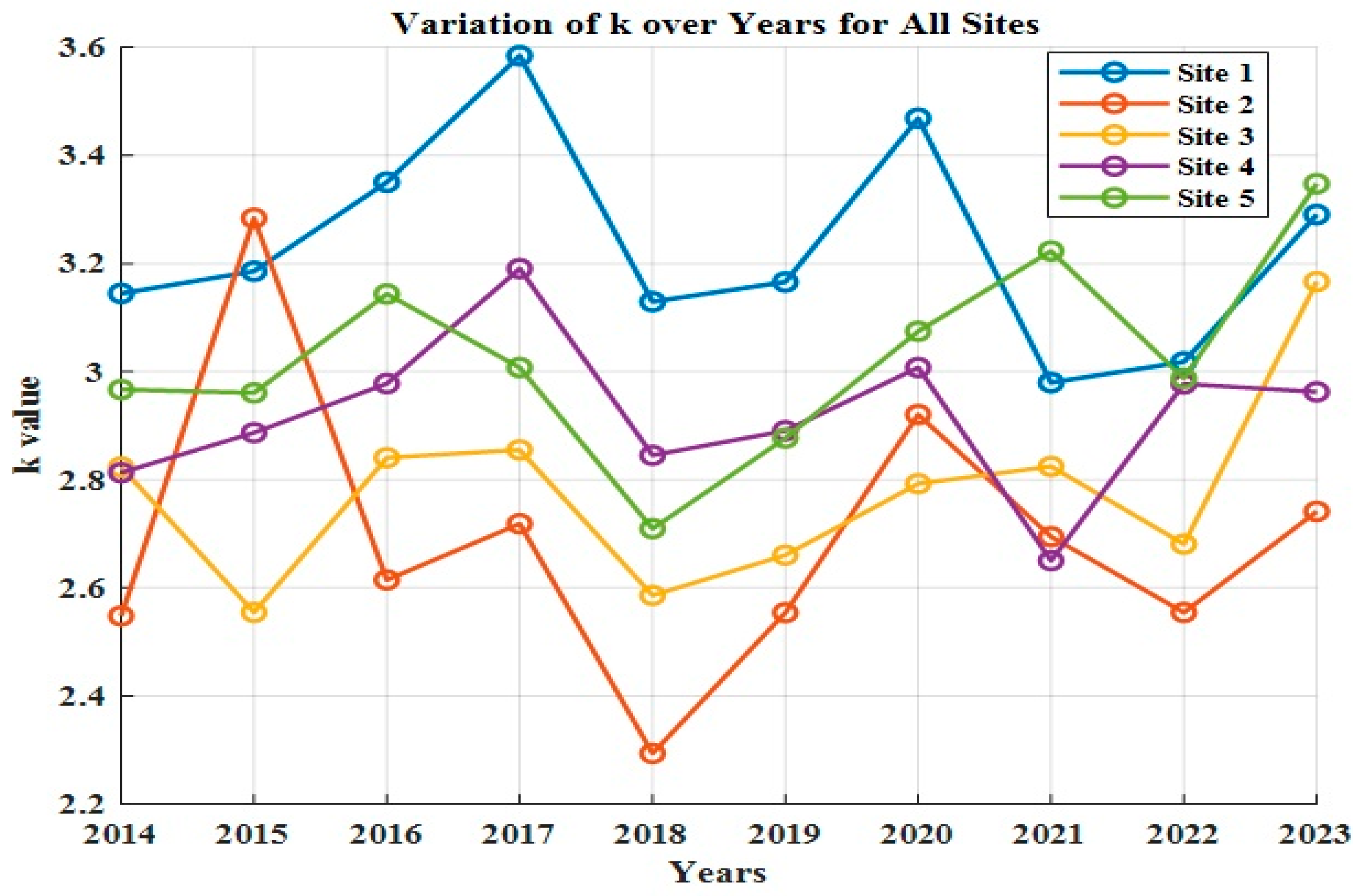 The shape parameter k of the Weibull distribution reflects wind variability, with higher k values indicating more uniform wind speeds—such as those observed at Sites 1 and 5. This stability corresponds to their coastal or near-coastal exposure, where steady monsoon flows and sea-breeze circulation prevail. In contrast, lower k values at inland locations indicate sporadic gusts influenced by local terrain effects. Similarly, the scale parameter c, which is directly associated with the mean wind speed, further reinforces this spatial distinction: higher c values in coastal regions signify stronger and more energetic wind regimes.