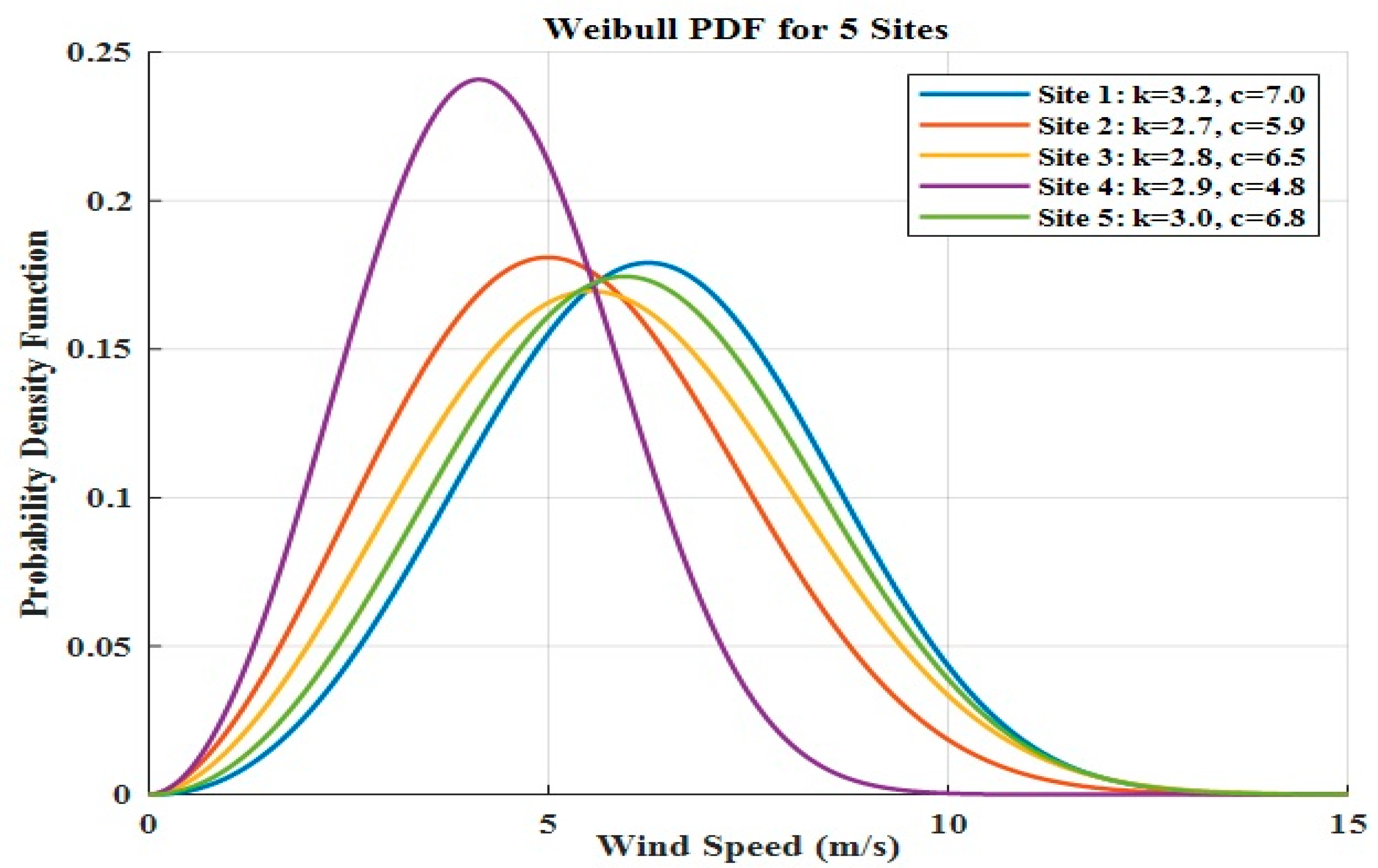 The Weibull distribution examination illustrates differences in the wind behavior across the five sites. Sites 1 and 5 exhibit the highest average wind power densities (≈206 W/m2 and 197 W/m2, respectively) and higher maximum energy-carrying wind speeds (≈7 m/s), indicating favorable conditions for wind energy extraction. These results classify both sites under WPD Class 3 (fair resource), suitable for IEC Class II wind turbines. Conversely, Sites 2 and 3 show moderate WPD values (≈135–175 W/m2), which, while lower, still support small- or medium-scale turbine installations. Site 4, with WPD below 70 W/m2 and ≈ 4.7 m/s, represents a low-wind zone unsuitable for economic wind power generation.