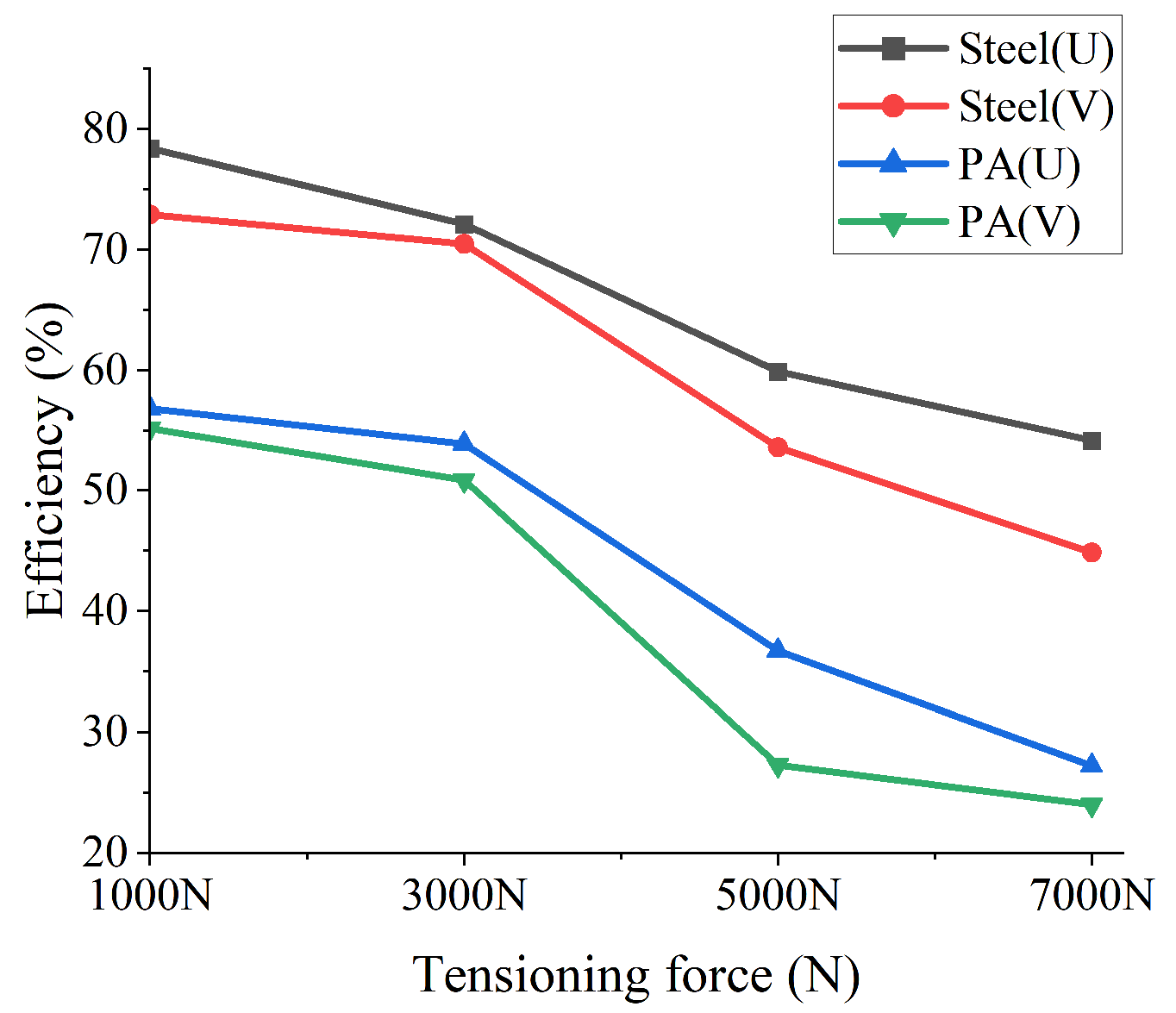 | Tensioning Force [N] | No Deviation Angle/Deviation Angle | No-Load/Load | Efficiency |