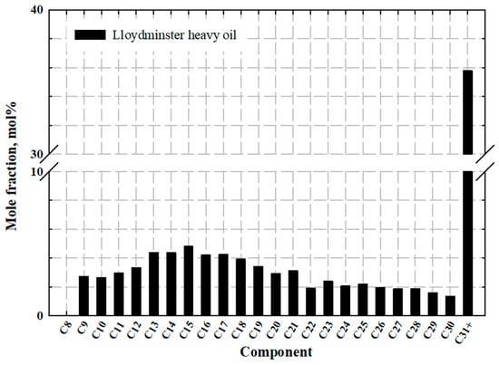 As for the gas exsolution experiments, the clean stock-tank heavy oil sample applied in the CO2-heavy oil system is collected from the Lloydminster area and has a molecular weight of 482 g/mol and a viscosity of 8251 cP at atmospheric pressures of 101.325 kPa and 298.15 K, respectively. Table 1 tabulates the detailed compositional analyses of the heavy oil sample, which is also described in Figure 2. The measured oil viscosities at different conditions for the heavy oil sample can be found elsewhere [32,33]. The purities of gaseous CO2 applied in the tests are 99.998 mol%. The detailed test feeds together with the measured and calculated and , which can be found in Table 2.