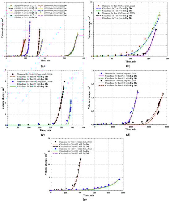During the CCE test, the dynamic pressure of the system on the sample side and the corresponding liquid volume is continuously tracked and recorded with time. To make the theoretical work more solid and conclusive, extra experimental data, i.e., Tests #6–7 [38], Tests #8–11 [35], and Tests #12–13 [38], are collected from the literature and the details pertaining to physical properties of heavy oil and the experiments can be found elsewhere [35,38,39,40].