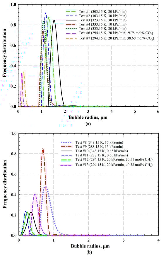 For huge heavy oil reserves, oil production can be boosted by inducing solution-gas drive associated with foamy oil (i.e., dispersed gas bubbles are partially or completely entrained in the oil phase) [1,2,3]. Physically, foamy oil is either naturally formed during the primary depletion of a heavy oil reservoir or artificially induced by injecting gaseous solvents (i.e., CO2, N2, air, and alkane solvents) into the depleted heavy oil reservoir, allowing us to maintain reservoir pressure and achieve higher oil recovery at a lower gas–oil ratio (GOR) [4,5,6,7]. To date, numerous efforts have been directed to evaluate the performance of solution-gas drives in a heavy oil reservoir, in which foamy oil phenomenon has been considered as the key factor that dominates heavy oil recovery [1,3,8,9,10]. During a gas-solution drive, heavy oil viscosity, pressure depletion rate, and dissolved gas concentration are found to affect gas exsolution behaviour and foamy oil stability, which describes the ability of heavy oil to resist the releasing of dispersed gas bubbles [11,12]. It is, therefore, necessary to quantify gas exsolution in heavy oil for the purpose of understanding the phase behaviour of foamy oil formed with the dispersed and nucleated gas bubbles, as well as evaluating and optimizing the solvent-assisted recovery methods in a heavy oil reservoir.