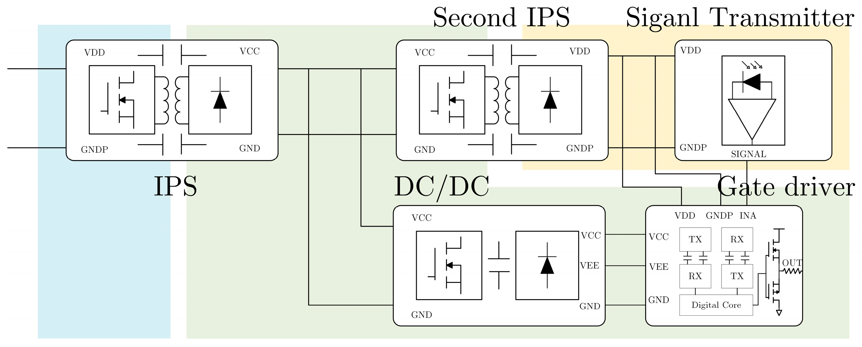 - Zhang, X.; Li, H.; Alex Brothers, J.; Fu, L.; Perales, M.; Wu, J.; Wang, J. A Gate Drive with Power Over Fiber-Based Isolated Power Supply and Comprehensive Protection Functions for 15-kV SiC MOSFET. IEEE J. Emerg. Sel. Top. Power Electron. 2016, 4, 946–955. [Google Scholar] [CrossRef]