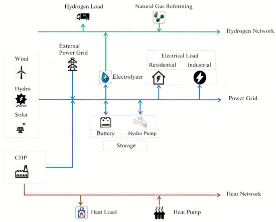 Existing research on IES has primarily focused on optimizing the configuration and operation of electricity–heat multi-energy systems at different spatial scales, such as buildings, communities and industrial parks. These studies have demonstrated that multi-energy coupling and coordinated dispatch can effectively reduce system operating costs and carbon emissions while improving the coordination capability of the power grid [9,10]. However, most of the current IES planning frameworks still emphasize the electricity–heat sector, and the role of hydrogen as a flexible, cross-sectoral energy carrier has not been fully integrated into city-level IES models.