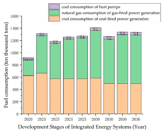 The fuel consumption of various power generation components and heat pumps for heating is shown in Figure 3 below. In 2020, natural gas power generation had not yet been expanded on a large scale, making coal power the primary form of electricity generation in Guangzhou’s urban area. Consequently, fuel consumption in 2020 was dominated by coal for coal power, followed by coal consumed by heat pumps for heat production; all natural gas consumption came from natural gas power generation. By 2025, the capacity of natural gas power generation units had increased by 200%. The figure shows that natural gas fuel consumption increased by 3.58 million tons, approximately a 140% rise. For the S2 scenario, which reduces the proportion of fossil fuel power generation (coal power capacity at 90% and natural gas power capacity at 70% of the forecasted development values for S1), coal and natural gas consumption decreased by about 5%. The S3 scenario, building on S2, increases natural gas power capacity while maintaining coal power capacity at 90% of S1 (same as S2). This results in natural gas consumption in S3 being 5% higher than in S1 and 11.7% higher than in S2. In the 2025 S4 scenario, which incorporates an 80 CNY/ton carbon emission penalty, the higher carbon cost for coal power relative to gas power leads to a 2% increase in natural gas consumption for power generation. In the 2030 S4 scenario, with the carbon penalty raised to 140 CNY/ton, the system’s optimization for minimizing the levelized cost of electricity (LCOE) leads to increased electricity purchases from the external grid to reduce carbon costs, consequently decreasing natural gas power generation by about 1%.