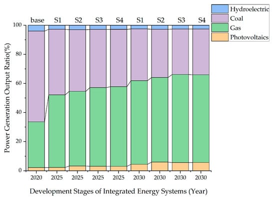 The electricity–heat–hydrogen integrated energy model optimizes the output of different generation units based on economic optimality principles, as shown in Figure 4. In 2020, coal power was the dominant form of fossil fuel generation. By 2025, with increased installed capacity, natural gas power output also rose. Compared to the 2020 baseline, the proportion of electricity generated from natural gas in the S1 scenario increased by 134%. Figure 5 shows that the installed capacity of natural gas units in the 2025 S1 scenario increased by about 176% compared to 2020. This discrepancy arises because the annual operating hours for natural gas units (~2920 h) are lower than those for coal units (~5839 h). Thus, with increasing overall electrical load and unchanged capacity, the increase in output from coal power is greater than from natural gas, explaining why the significant capacity increase for gas doesn’t translate proportionally into output share. In the S2 scenario, with solar PV capacity increased by 30%, biomass capacity by 50%, and coal power capacity reduced to 90% of the forecast, the share of electricity from natural gas increases by 4% compared to S1. The S3 scenario assumes a further increase in natural gas power capacity compared to S2, leading to a corresponding rise in its output share. The S4 scenario introduces a carbon emission penalty on top of S3. Notably, compared to S3, the share of fossil fuel generation decreases in S4, while the share of purchased electricity increases, a point reflected in the system economics section.