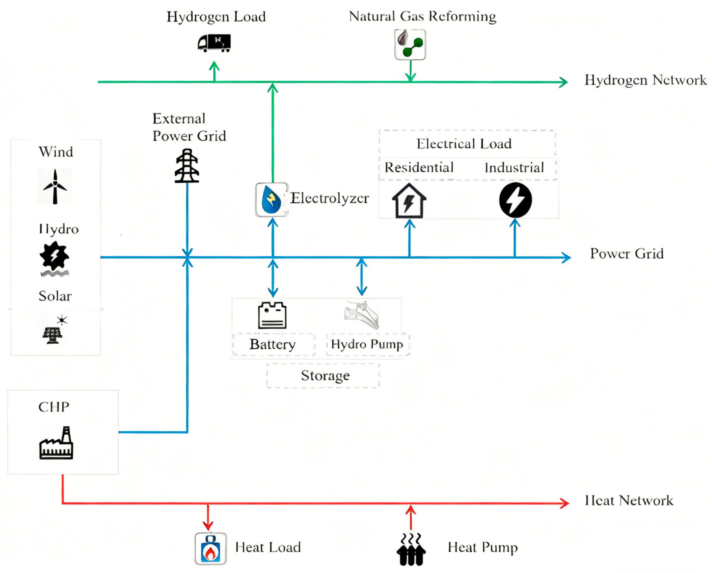 - Liu, J.; Cao, X.; Xu, Z.; Guan, X.; Dong, X.; Wang, C. Resilient operation of multi-energy industrial park based on integrated hydrogen-electricity-heat microgrids. Int. J. Hydrogen Energy 2021, 46, 28855–28869. [Google Scholar] [CrossRef]