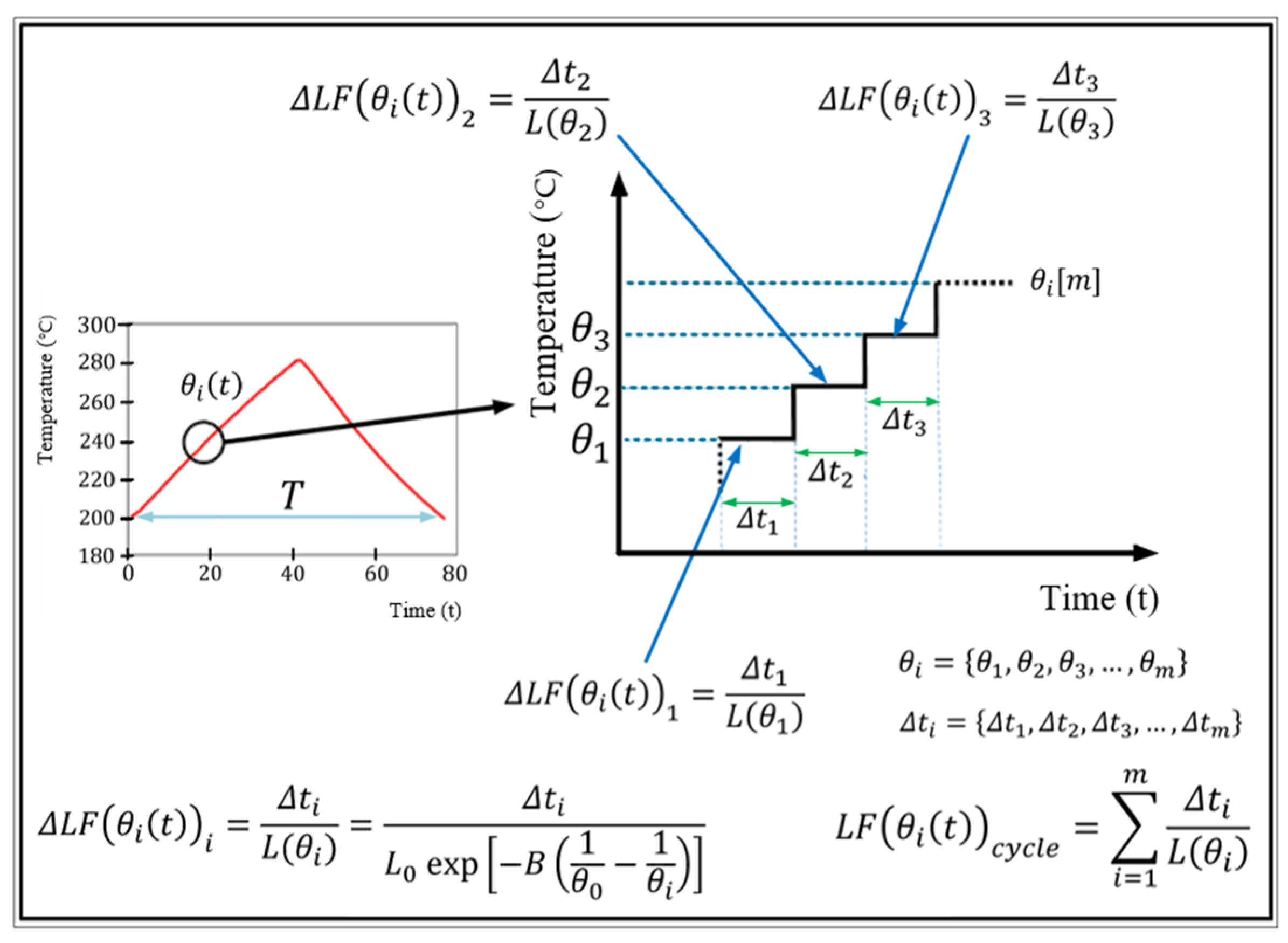 97]. Mechanical fatigue, vibration-induced stress, or electric field effects that may occur concurrently during thermal cycling are not explicitly accounted for in the equivalent temperature formulation. Their contribution is generally minor under moderate operating conditions but can become significant in applications involving strong electro-mechanical coupling or repetitive start-stop cycles. Awareness of this limitation is, therefore, essential to ensure the correct interpretation of results and to avoid overestimating lifetime when nonthermal factors are present [