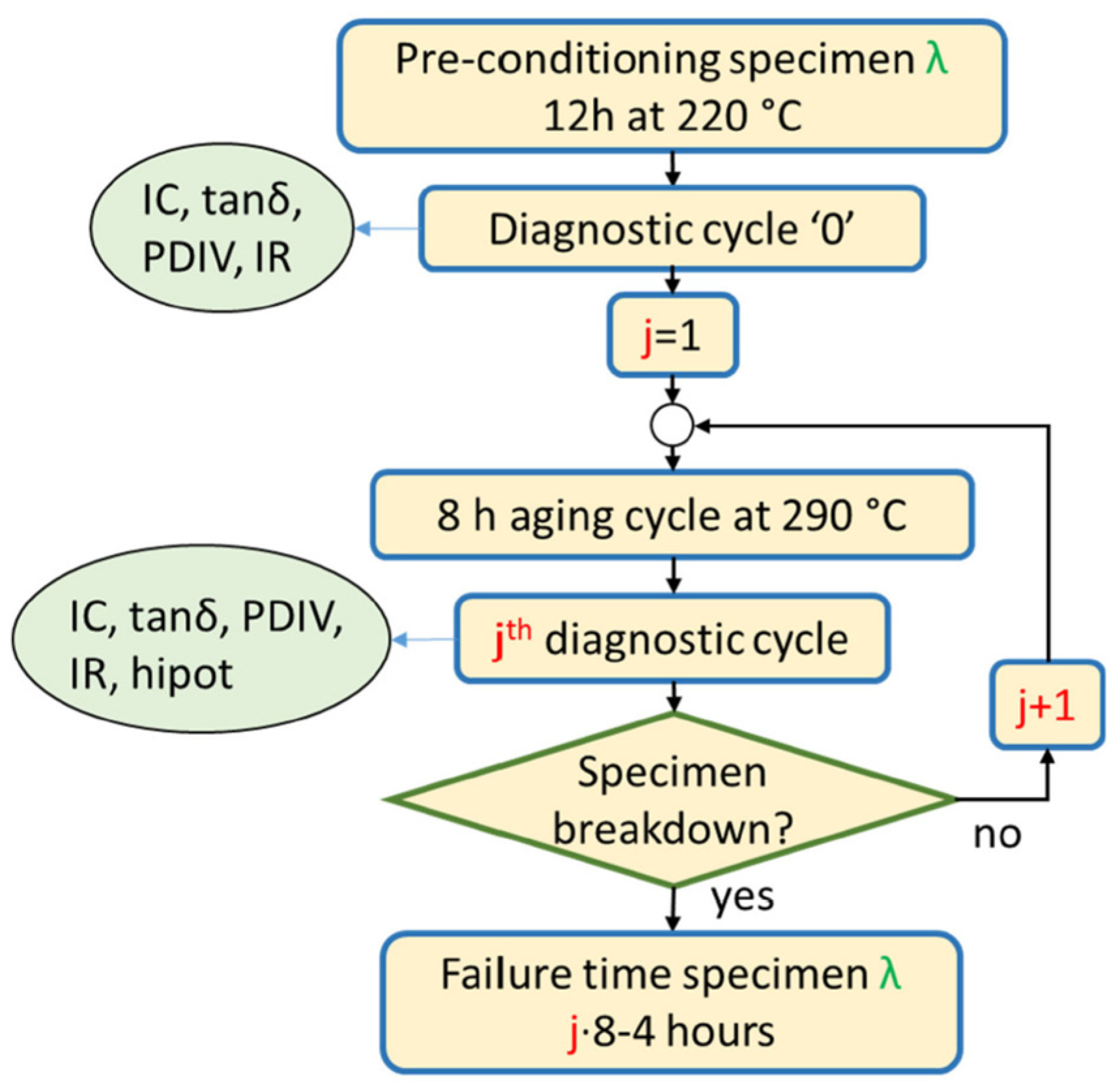 112] procedures, using round copper conductors of 0.4 mm diameter coated with a double-layer enamel of modified polyester and polyamide-imide. Thirty specimens were aged in a controlled oven at 250 °C, 270 °C, and 290 °C, with diagnostic measurements including IR, IC, and