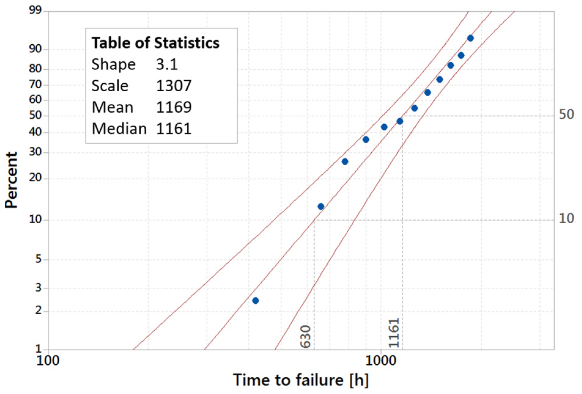 Figure 10, the fitted distribution yields a B10 percentile lifetime of approximately 630 h and a B50 lifetime of around 1161 h. These values indicate that under the applied accelerated ageing conditions, 10