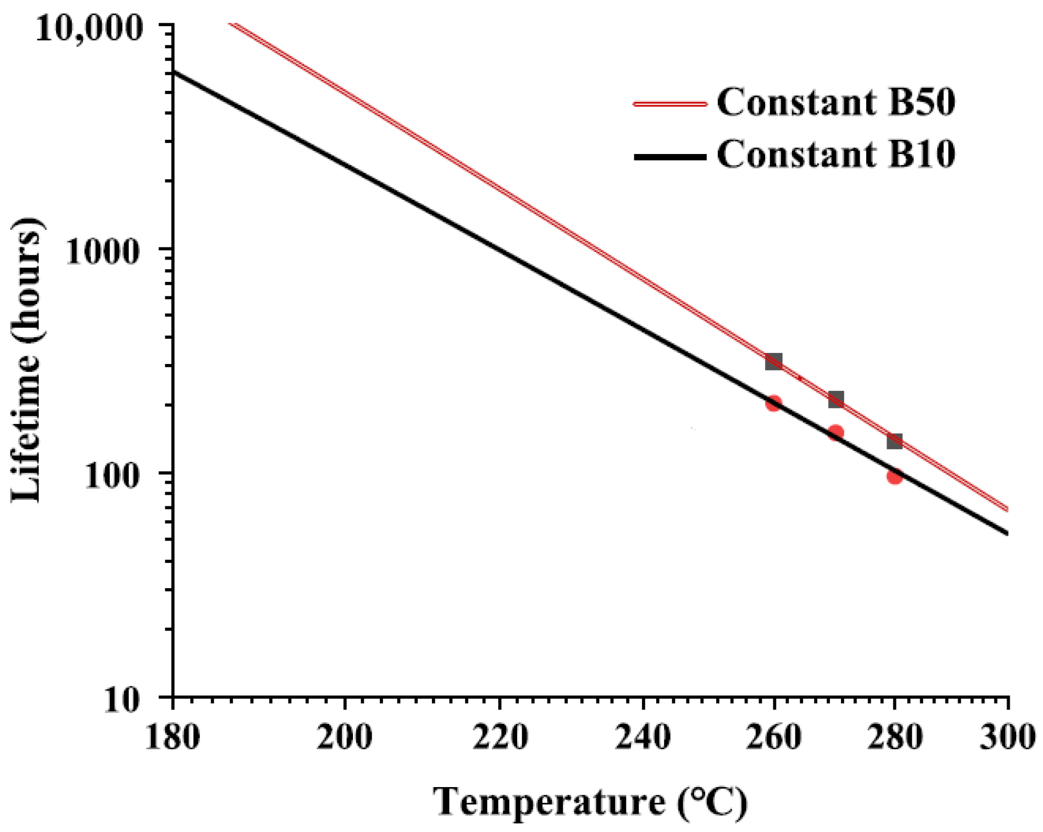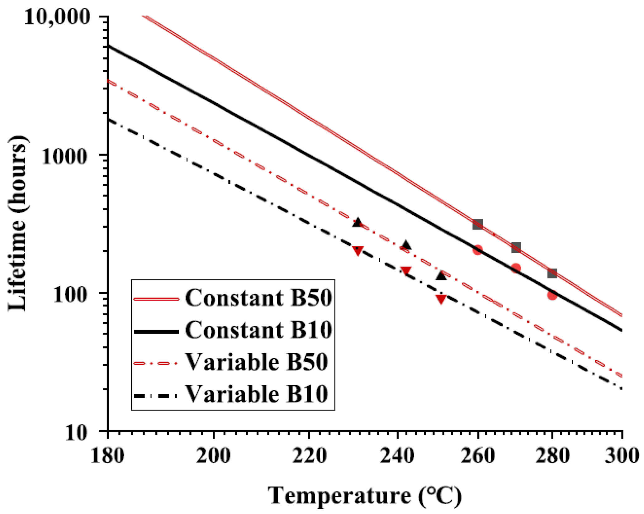 The percentile lifetime values for variable-temperature ageing were calculated at three equivalent average temperatures, reflecting the periodic cycling between 220 and 260 °C, 230–270 °C, and 240–280 °C. These three operating windows provide the representative data points from which the variable-temperature B10 and B50 curves were constructed, as illustrated in