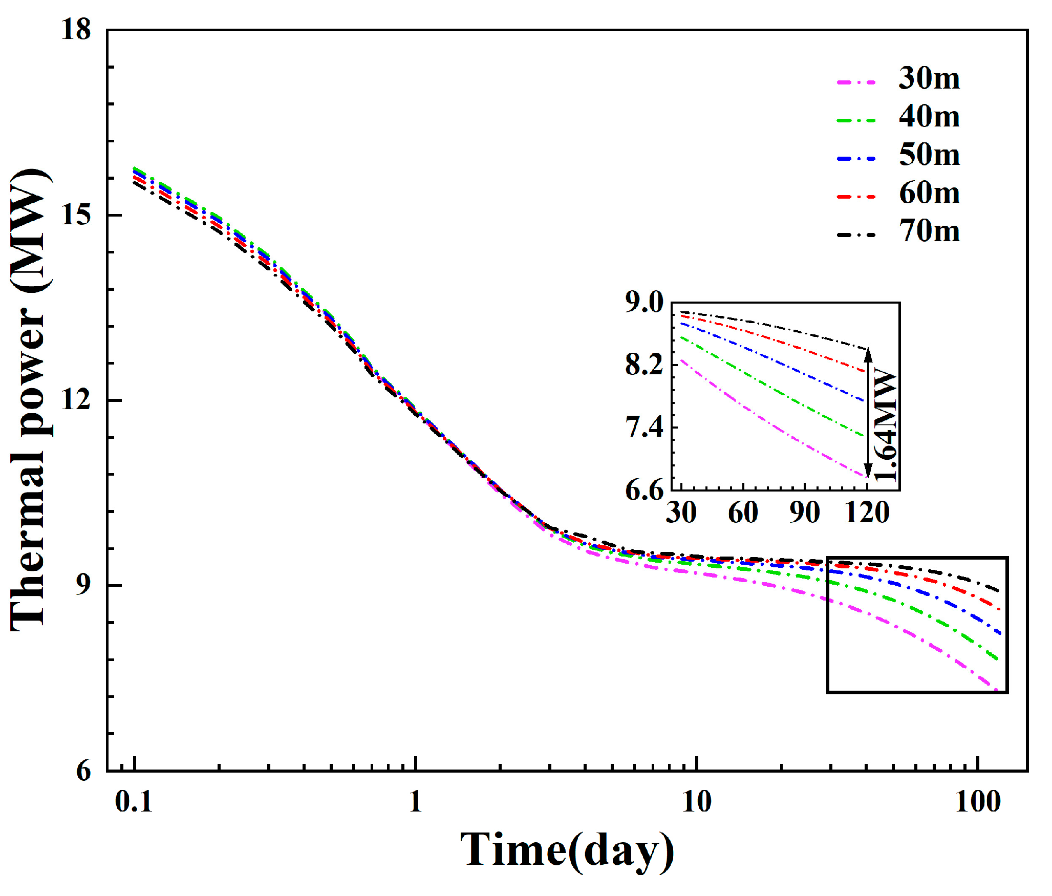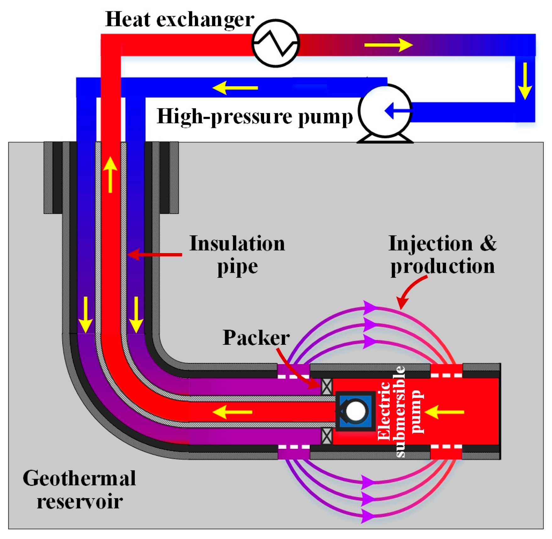- The insulated pipe plays a key role in the heat loss of the production fluid, and the temperature decrease is only 0.29 °C after 120 days if the inner pipe has an excellent insulation performance. The fluid temperature increase in the annulus is only 1.24 °C after 120 days, while it exceeds 50 °C in the geothermal reservoir. Thus, the fractured reservoir dominates the heat extraction capacity of the injection fluid.