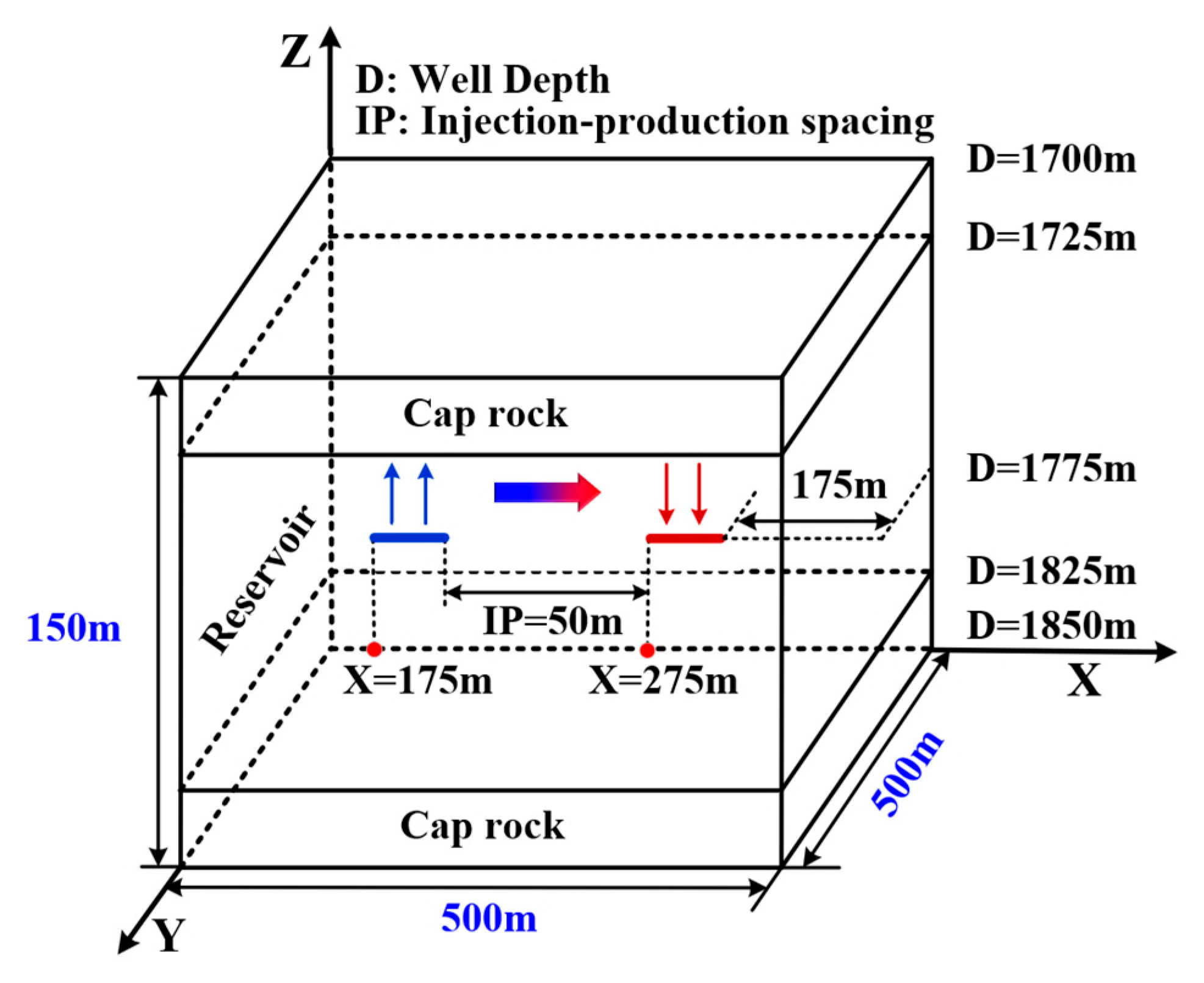 - The diameter of the inner pipe can affect the injection–production pressure difference by changing the flow spaces of the inner pipe and the annulus, and the injection–production pressure difference is the lowest when the inner pipe’s diameter is 0.12 m or 0.13 m. A longer injection section can effectively delay thermal breakthrough and reduce the injection–production pressure difference. The thermal breakthrough is limited if the injection–production spacing exceeds 70 m.