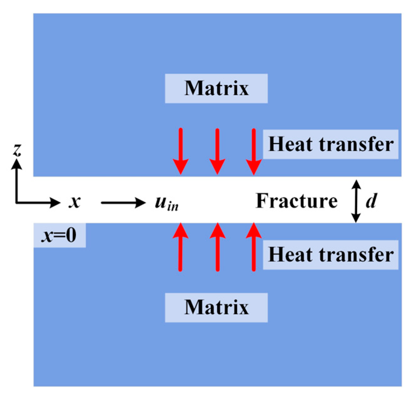 - The fractured geothermal reservoir (aquifer zone) is described based on the dual-porosity theory to ensure calculational efficiency. It conceptualizes the system as two superimposed continua (see Figure 2) [12]: a matrix region providing storage capacity, and a fracture region offering dominant flow channels.