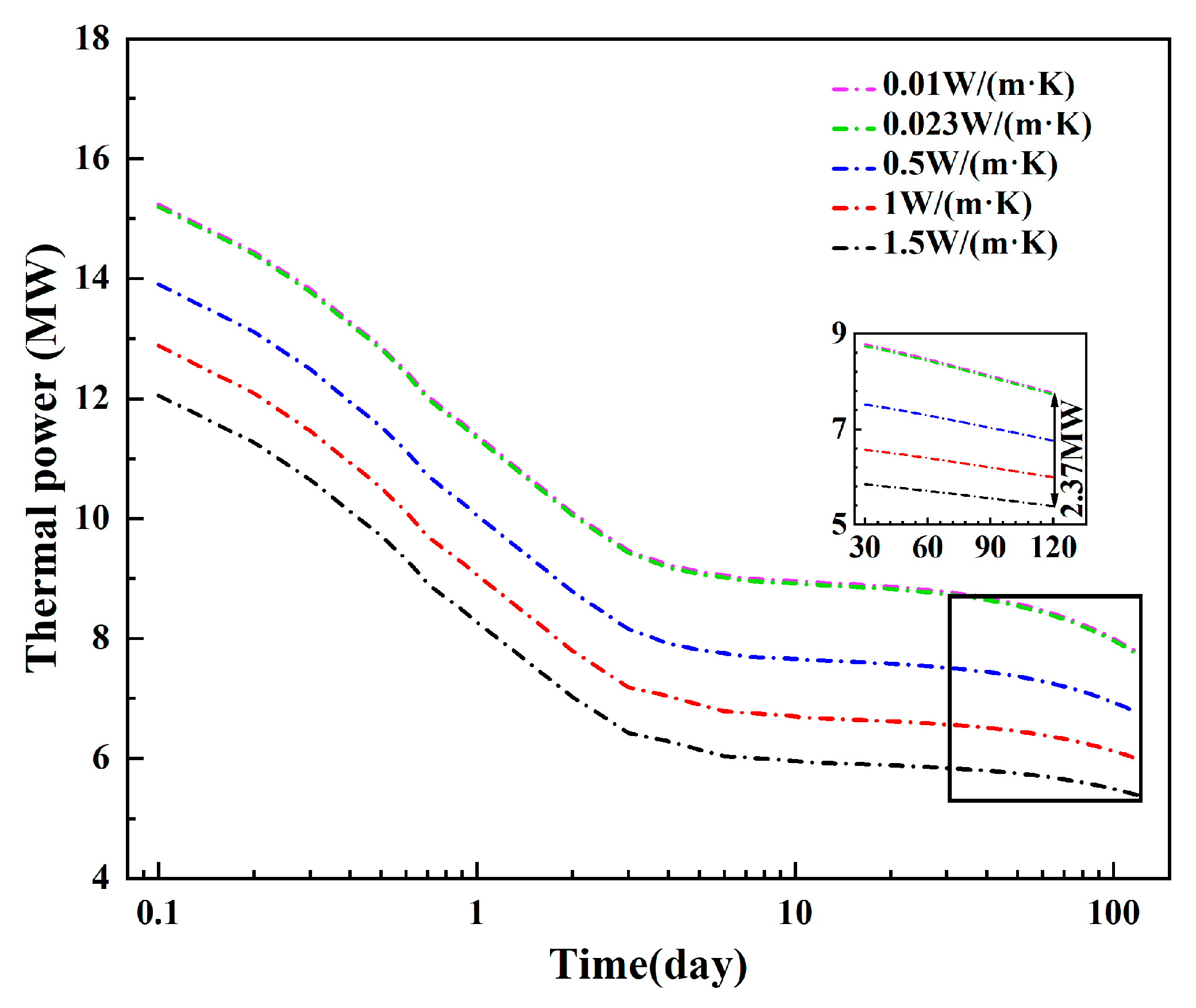 - The inner pipe’s thermal conductivity can significantly impact the production temperature and thermal power. To ensure heat output, it is necessary to use an insulated inner pipe with a low thermal conductivity. The production temperature decrease is negligible when the inner pipe’s thermal conductivity is less than 0.023 W/(m·K). Appropriate reductions in the inner pipe’s thickness can help to reduce the injection–production pressure difference, and a thickness of 0.015 m is appropriate to decrease the heat loss and obtain a relatively low injection–production pressure difference.