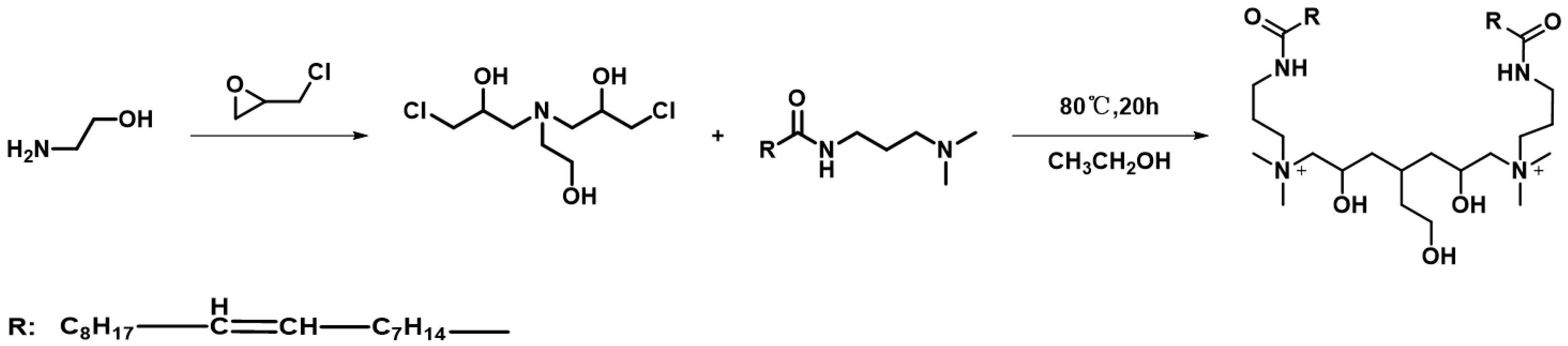 - Dai, R.Y.; Shen, J.; Xu, H.J. Study on the synthesis and properties of Gemini surfactant with ester spacers. Tenside Surfactants Deterg. 2025, 62, 109–117. [Google Scholar] [CrossRef]