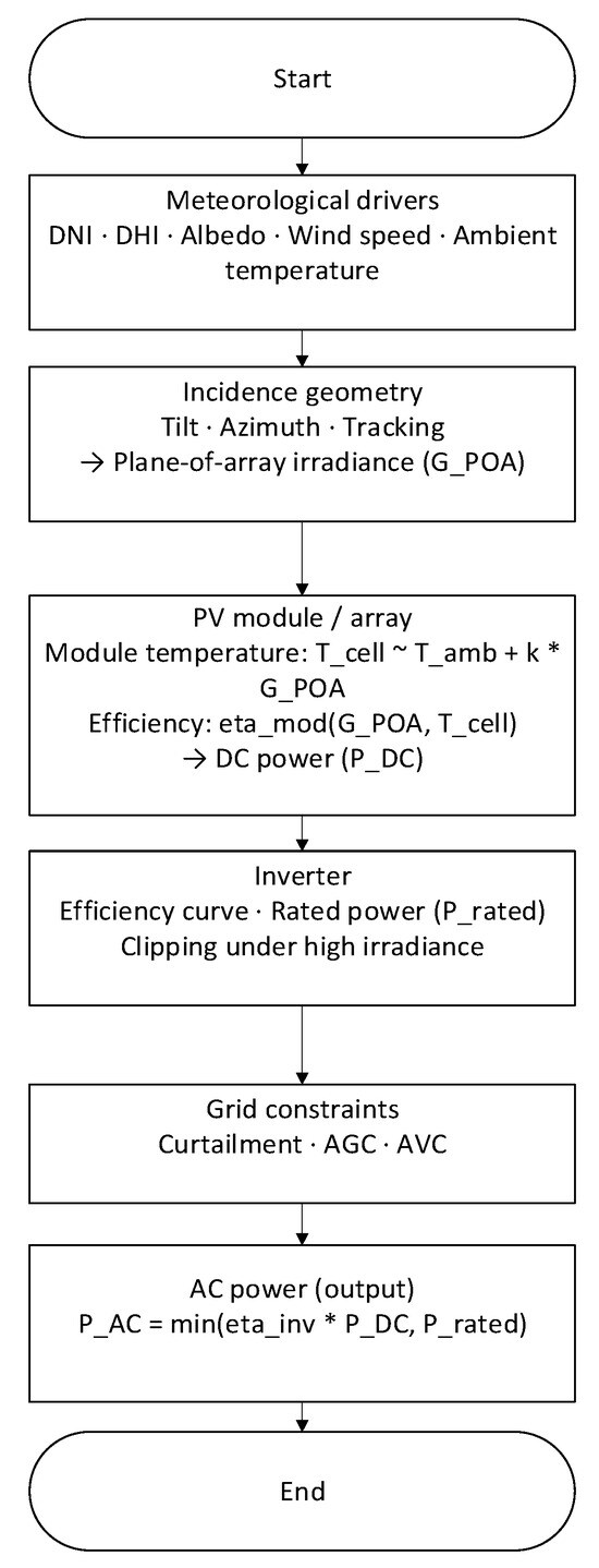 To facilitate understanding of the energy chain and disturbance locations, Figure 1 provides an overview from meteorological drivers → incident geometry and → module/array → inverter and grid constraints → output , highlighting the effects of fast cloud edges, shading/soiling, clipping, and control commands on curve morphology.