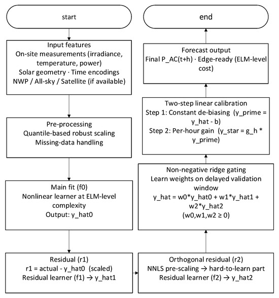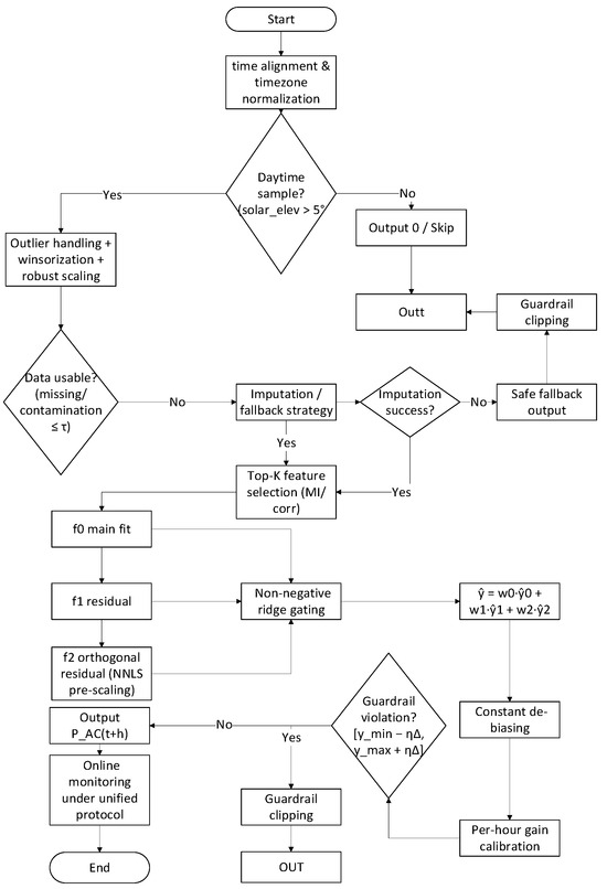 End-to-end flowchart of lightweight ELM for PV power forecasting. After time alignment and time zone normalization, a daytime gate (solar_elev > 5°) routes non-daylight samples to Output 0/Skip. Daylight samples undergo outlier handling (winsorization) and robust scaling, followed by a data-usability check; if imputation/fallback fails, a safe fallback output is returned with guardrail clipping. Otherwise, Top-K features feed three learners—f0 (main fit), f1 (residual), and f2 (orthogonal residual via NNLS pre-scaling). Their predictions are fused by non-negative ridge gating to obtain then corrected by a two-step linear calibration (constant de-biasing and per-hour gain). A guardrail check clips outputs to [ymin − η∆, ymax + η∆], yielding the final . All scalers, feature lists, and weights are frozen at deployment, and metrics are monitored under a unified protocol (chronological split, daytime mask, and MAPE with a denominator floor).
