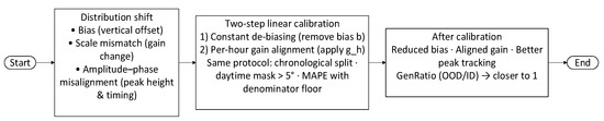 To enhance comparability and robustness across sites/seasons, dimensionless normalization is often performed using power envelope clearance () or nameplate capacity, defining the clearance index to absorb dimensional differences. Input-side processing employs time alignment and time zone normalization, solar mask (solar elevation angle > 5°), outlier/missing data handling (e.g., winsorization and interpolation), and quantile-based robust scaling to mitigate pollution effects on training and evaluation. Cross-season/cross-site transfer introduces amplitude bias and scale mismatch, causing uncalibrated forecasts to exhibit systematic deviations in peak values and overall magnitude. Rapid cloud windows also induce amplitude–phase coupling, where peak height and arrival time shift simultaneously. Figure 3 illustrates a two-step linear calibration under unified evaluation metrics (time-sequence segmentation, daytime scope, MAPE denominator floor): first constant bias removal, then hourly gain alignment to correct scale and peak without altering main model complexity. At time t, we predict future active power at time using the historical window (field measurements, clear-sky index, solar geometry, NWP, time encoding, etc.).