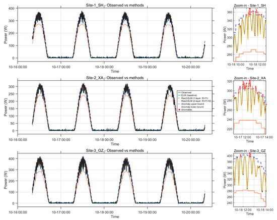 Under strict chronological splits and a unified evaluation protocol, the proposed lightweight Res2-ELM-C—two residual layers fused by non-negative ridge gating and followed by a two-step linear calibration—provides accurate and stable three-site hourly forecasts: overall RMSE around 3.51 W, consistently high correlation (r ≈ 0.9995), and MAPE near 2.25%. Multi-site profiles and zoom-in windows indicate that the “residual stacking + hourly calibration” pathway better preserves phase and amplitude around peaks and inflection segments than classical ELM/OLS/SVR, while avoiding the mild overshoot/phase lag occasionally observed with LSTM/GRU in high-gradient periods.