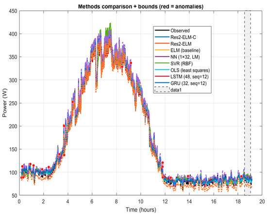 Full-day end-to-end overlay including deep learning baselines (LSTM/GRU), with anomaly envelopes and markers. Res2-ELM-C alleviates peak compression and phase lag around peaks/inflections; OLS/SVR show systematic bias; and LSTM/GRU track the trend but exhibit mild overshoot.
