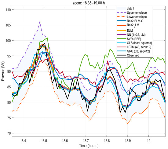 Evening zoom (18.35–19.08 h) with all methods including LSTM/GRU. Res2-ELM-C (two-layer + calibration) matches local peaks/valleys and rapid dips; NN/SVR and LSTM/GRU show amplitude/phase deviations near sudden occlusions; and OLS is over-smoothed.