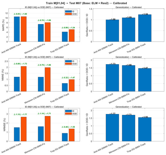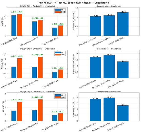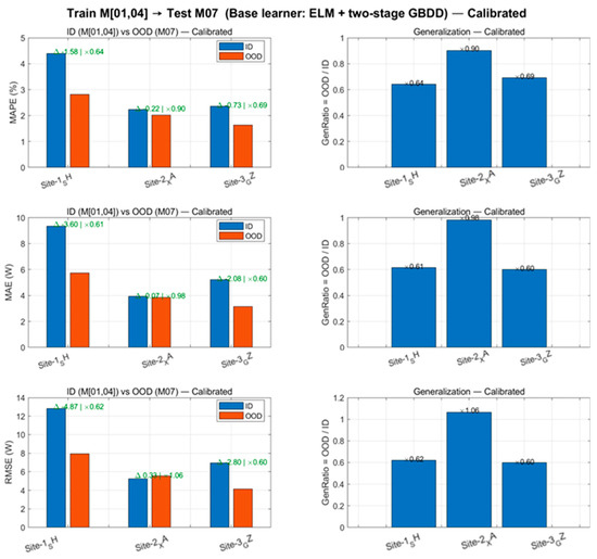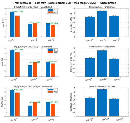 To objectively demonstrate the degradation and calibration effects across seasonal deployments, this section calculates the MAE/RMSE/MAPE metrics and the out-of-domain/in-domain ratio (GenRatio) across three sites. Figure 8 presents the metric comparisons and distribution differences for the uncalibrated scenario.