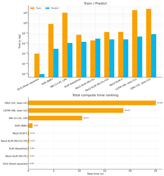 Compute time (log scale). Leveraging closed/near-closed form training, ELM family models remain orders of magnitude faster to train and keep the total wall-clock small: ELM baseline and Res2-ELM/Res2-ELM-C finish in ≈0.09–0.16 s total (ELM: train 0.0716 s, predict 0.0146 s; Res2-ELM: train 0.1337 s, predict 0.0253 s; Res2-ELM-C: train 0.1384 s, predict 0.0253 s). By contrast, SVR requires ≈0.83 s total (train 0.829 s, predict 0.0030 s), the small NN (1 × 32, LM) needs ≈ 10.57 s (train 10.56 s, predict 0.0113 s), while LSTM (48, seq = 12) and GRU (32, seq = 12) are heavier at ≈18.68 s (train 18.63 s, predict 0.0478 s) and ≈25.06 s (train 24.98 s, predict 0.0837 s), respectively. OLS is essentially negligible in time (≈0.0024 s total). Notably, the two-step linear calibration adds only ≈4.7 ms training overhead (0.1384 vs. 0.1337 s) and no extra inference cost.