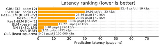 Per-point prediction latency and throughput. At batch-1 inference, ELM baseline achieves ≈12.77 μs/pt (≈78 kS/s), while Res2-ELM/Res2-ELM-C are ≈23.86 μs/pt (≈42 kS/s); the calibration step is latency-free (overlapped bars). LSTM and GRU exhibit higher per-point latency at ≈29.91 μs/pt (≈33 kS/s) and ≈52.41 μs/pt (≈19 kS/s), respectively. Although SVR (≈2.21 μs/pt, ≈452 kS/s) and the small NN (≈3.70 μs/pt, ≈270 kS/s) show low per-point latency, they incur substantially larger training/total time (Figure 10) or different robustness trade-offs. OLS is trivial in latency but notably less accurate.