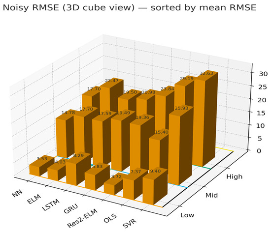 Forecasting robustness to sensor noise: absolute Noisy RMSE of seven models across three noise levels (Low/Mid/High; Gaussian σ = 0.01/0.03/0.06 scaled by per-feature training std; feature-wise dropout 0/0.01/0.02). Colored grid lines on the floor simply delineate the noise blocks and panel boundary for visual clarity and do not encode additional information. Lower is better.
