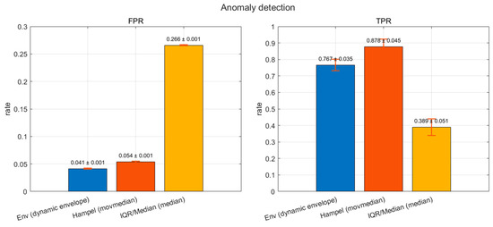 Anomaly detection performance under daytime evaluation: FPR (false positive rate) and TPR (true positive rate) of three detectors—Dynamic Envelope, Hampel (moving median), and IQR/Median. Bars show mean ± standard deviation over repeated trials.