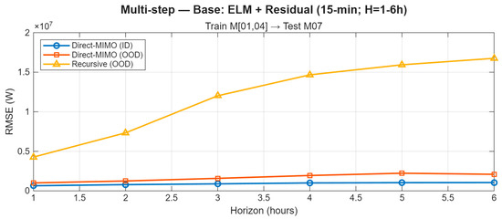 Trained on M01 and M04 and evaluated on the cross-season month M07, the proposed Direct-MIMO (joint 1–6-step outputs) displays a smooth, near-linear RMSE growth with horizon on both ID and OOD data (Figure 16). In contrast, the recursive baseline—rolling a one-step model forward—shows clear error compounding, with OOD RMSE increasing markedly from short to long horizons. Averaged across representative sites, Direct-MIMO remains consistently below the recursive curve at every horizon, indicating no runaway accumulation. This stability is attributable to learning each horizon directly from exogenous features and residual cues (mitigating exposure bias) and to the residual-stacked ELM backbone, which provides horizon-aware corrections without over-smoothing.