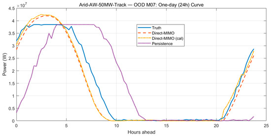 One-day (24 h) trajectory under OOD month M07 at site “Arid-AW-50MW-Track”: Truth vs. Direct-MIMO (uncalibrated/hourly bias-calibrated) vs. Persistence (previous-day).