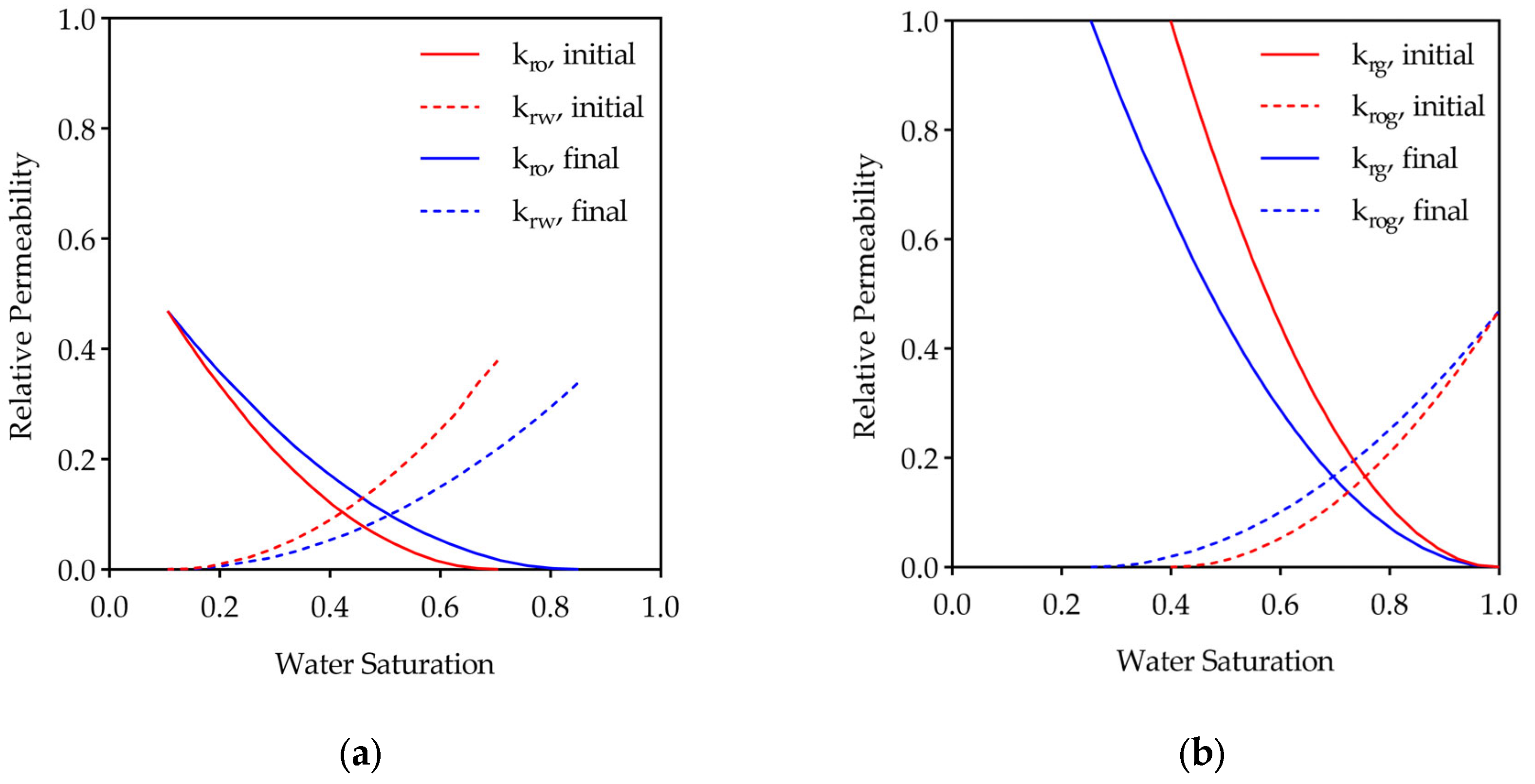 To implement wettability alteration, the relative permeability curves of Yousef et al. (2011) were used (Figure 1), and the Ca2+ concentration was used as an indicator of the relative permeability shift phenomenon [19,25]. Depending on the salinity of the brine, the relative permeability function in different wettability conditions was approximated using linear interpolation. These datasets were used as input parameters for the GEM compositional simulator developed by CMG.