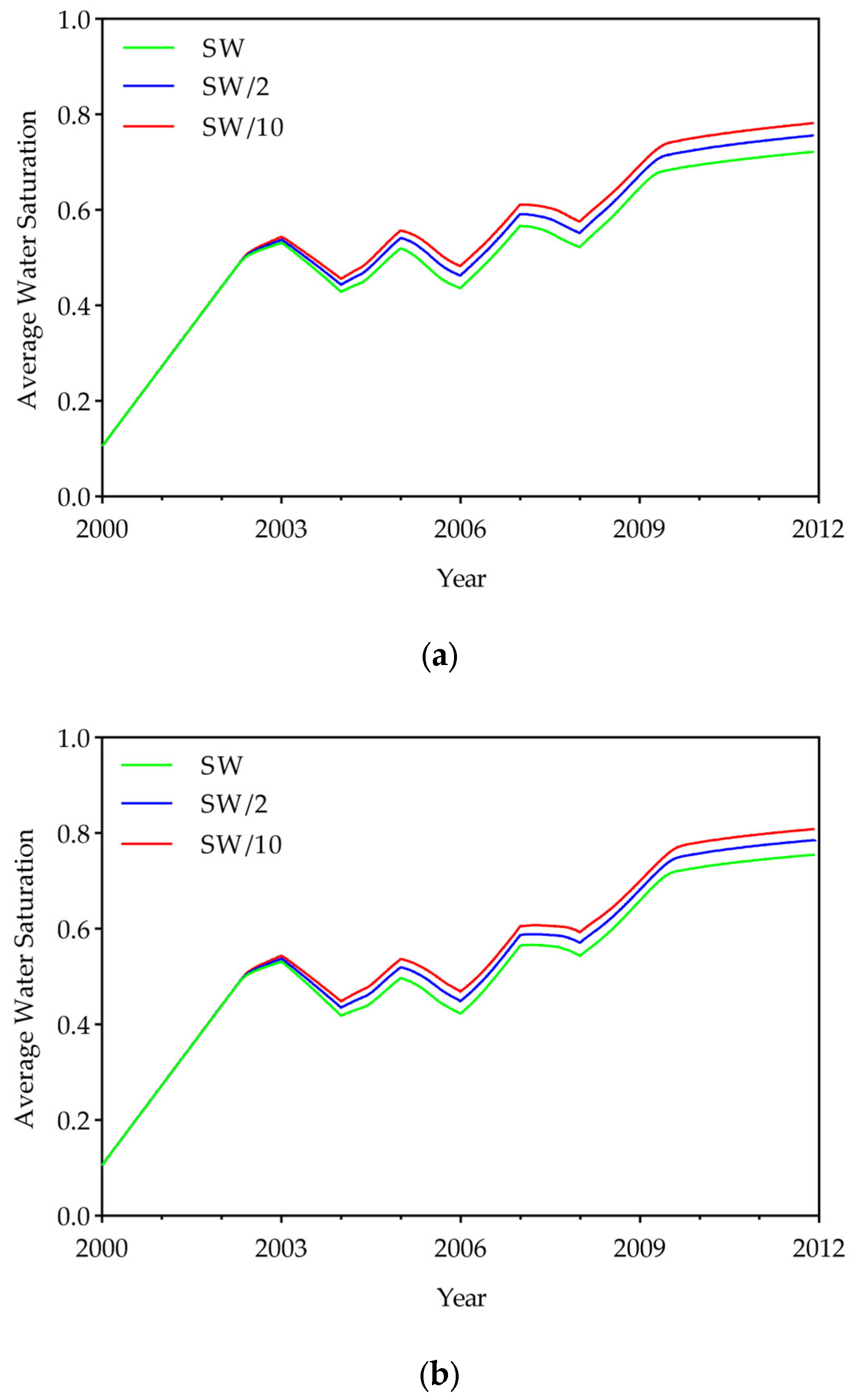 LSWI enhances oil recovery by inducing a wettability alteration, which shifts the rock from an oil-wet to a water-wet state. As shown in Figure 3, in all cases, water saturation increased as salinity decreased. Compared with seawater (SW), the average water saturation of twice-diluted seawater (SW/2) increased by an average of 3.9%, and that of ten-times-diluted seawater (SW/10) increased by an average of 7.0%. This change not only improves oil recovery but also increases the average water saturation within the reservoir.