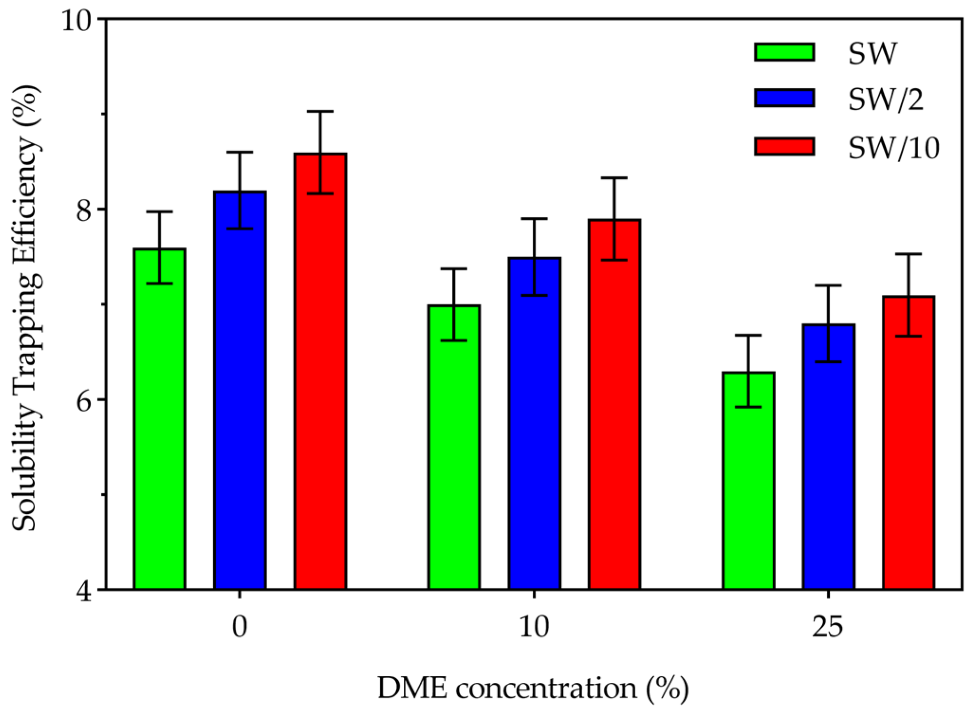 Furthermore, lower salinity in the water mitigates the salting-out effect, increasing the solubility of CO2 in the aqueous phase. Consequently, as salinity decreases, a greater amount of CO2 can be stably trapped. Figure 4 specifically illustrates the solubility trapping efficiency, which is defined as the ratio between the amount of soluble CO2 trapped and the amount of CO2 injected. The average values were 6.9% for SW, 7.5% for SW/2, and 7.9% for SW/10, demonstrating an increasing trend with decreasing salinity.
