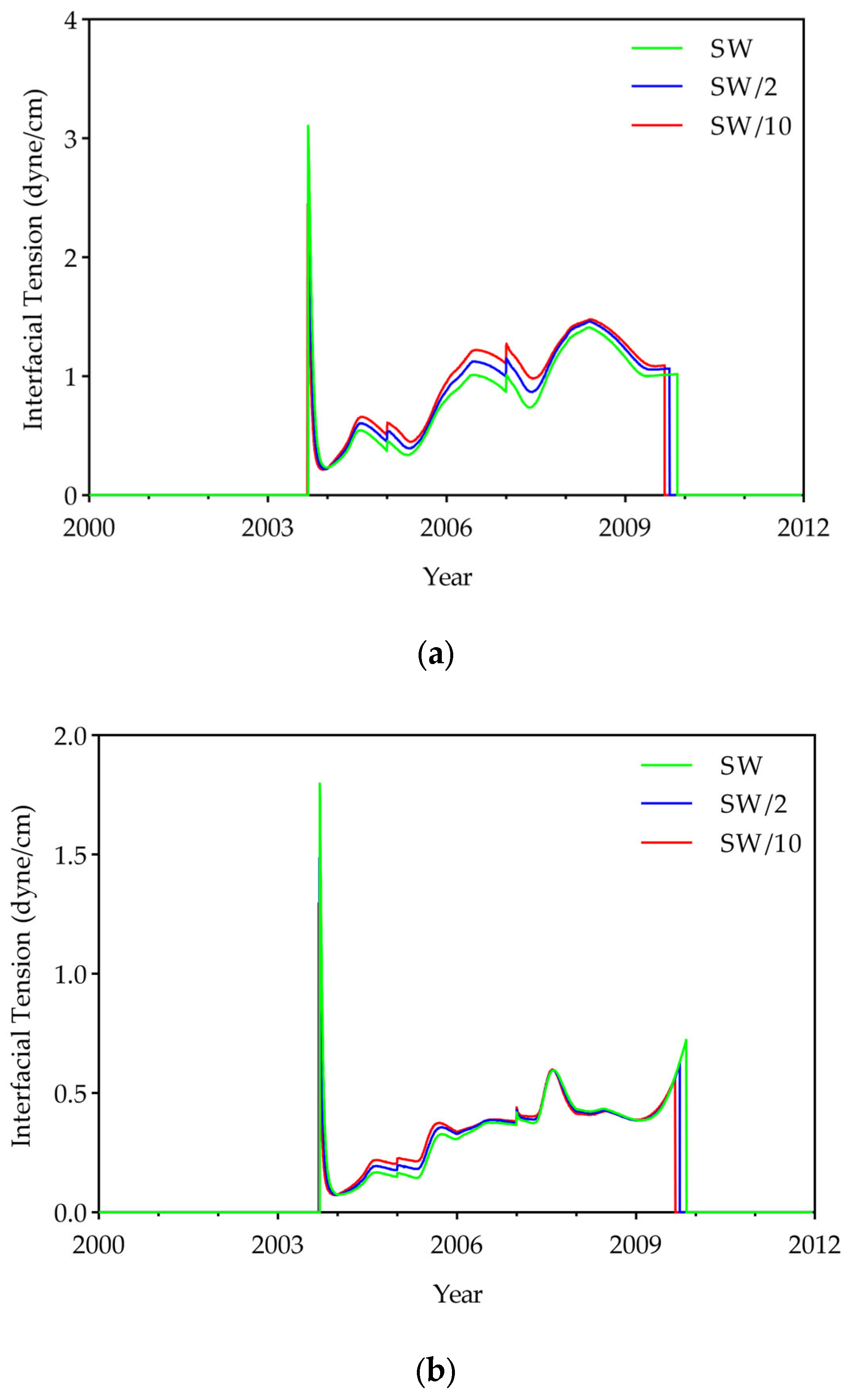 The wettability alteration from oil-wet to water-wet using LSWI was first reported by Morrow and Buckley (2006) [24]. Since then, various mechanisms have been proposed, such as fines migration, multi-ion exchange, electrical double layer expansion, osmosis, in situ soap generation, and IFT reduction. However, no single mechanism has yet provided a complete explanation [7]. These various mechanisms all contribute to enhanced oil recovery as the salinity of the injected brine decreases. Therefore, this study simulates the behavior of the CO2/DME-LSWAG phenomenon. The properties of each brine used in the simulation are presented in Table 5.