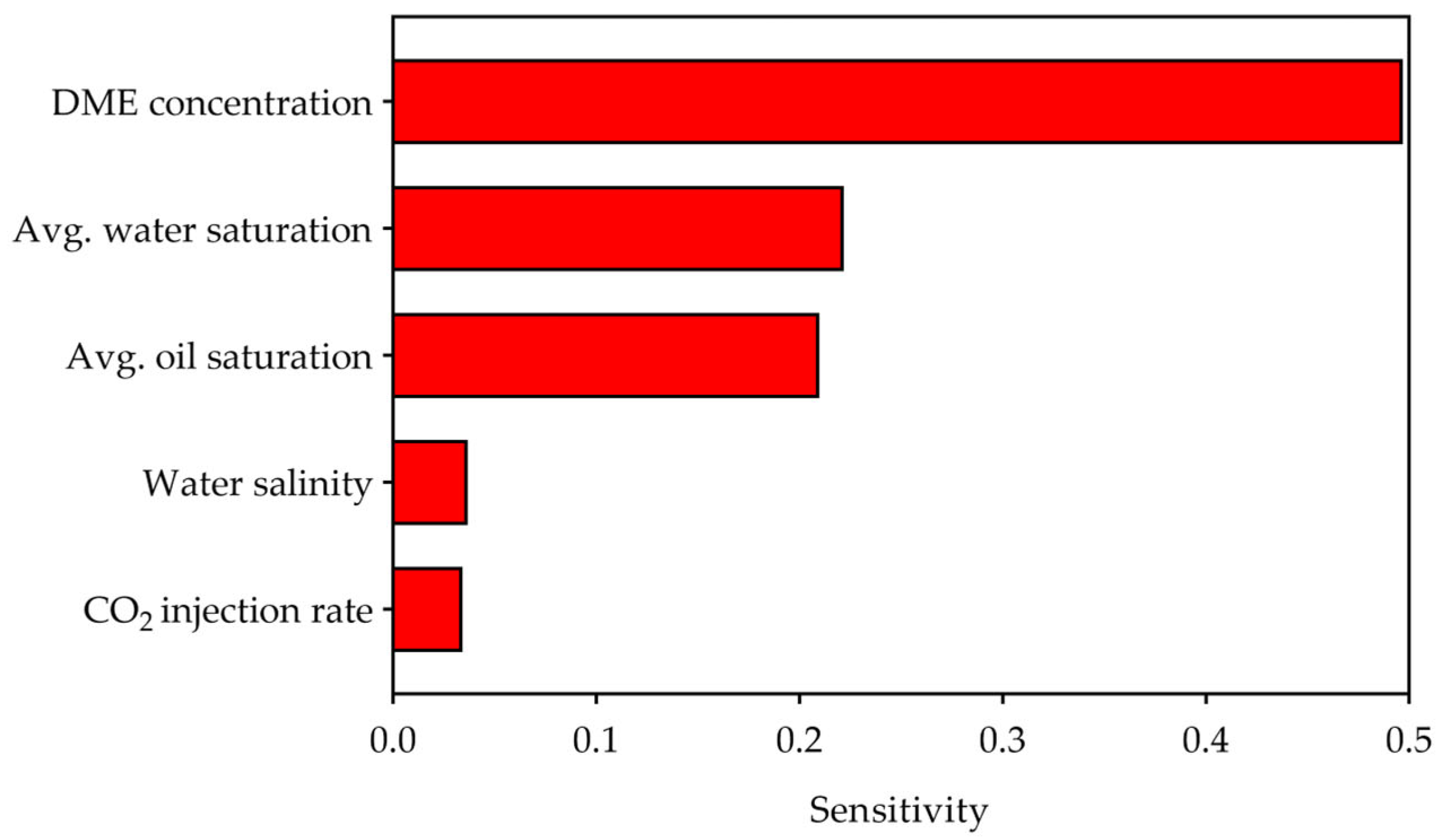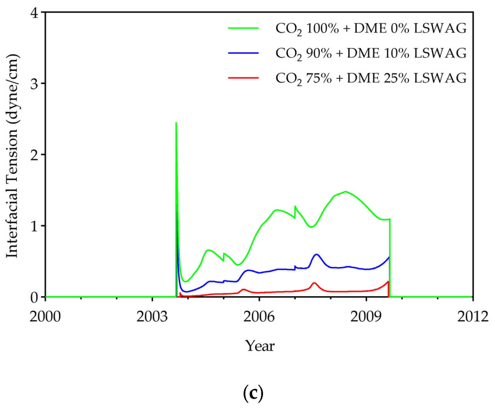 DME has physical properties similar to those of liquefied petroleum gas. However, it is low-toxicity, non-corrosive, and non-carcinogenic and is not classified as a greenhouse gas. Its solubility in water is about 1000 times greater than that of propane, allowing solubility and stable in water [9]. In addition, DME increases the viscosity of CO2 and inhibits diffusion [10]. When it contacts oil, a first-contact miscibility process occurs, reducing the viscosity of the oil and causing it to expand, improving its mobility [11]. However, due to the high cost of DME, there are few EOR studies utilizing it. Most DME studies have been conducted with DME-enhanced waterflood [11] or DME or CO2/DME injection [12,13,14,15,16], and molecular dynamics simulations [10,17]. Recently, a study was conducted to investigate the effect of DME in dynamic conditions using WAG numerical simulations of mixed CO2 and DME solvents in a 2D cross-sectional reservoir model [16,18].
