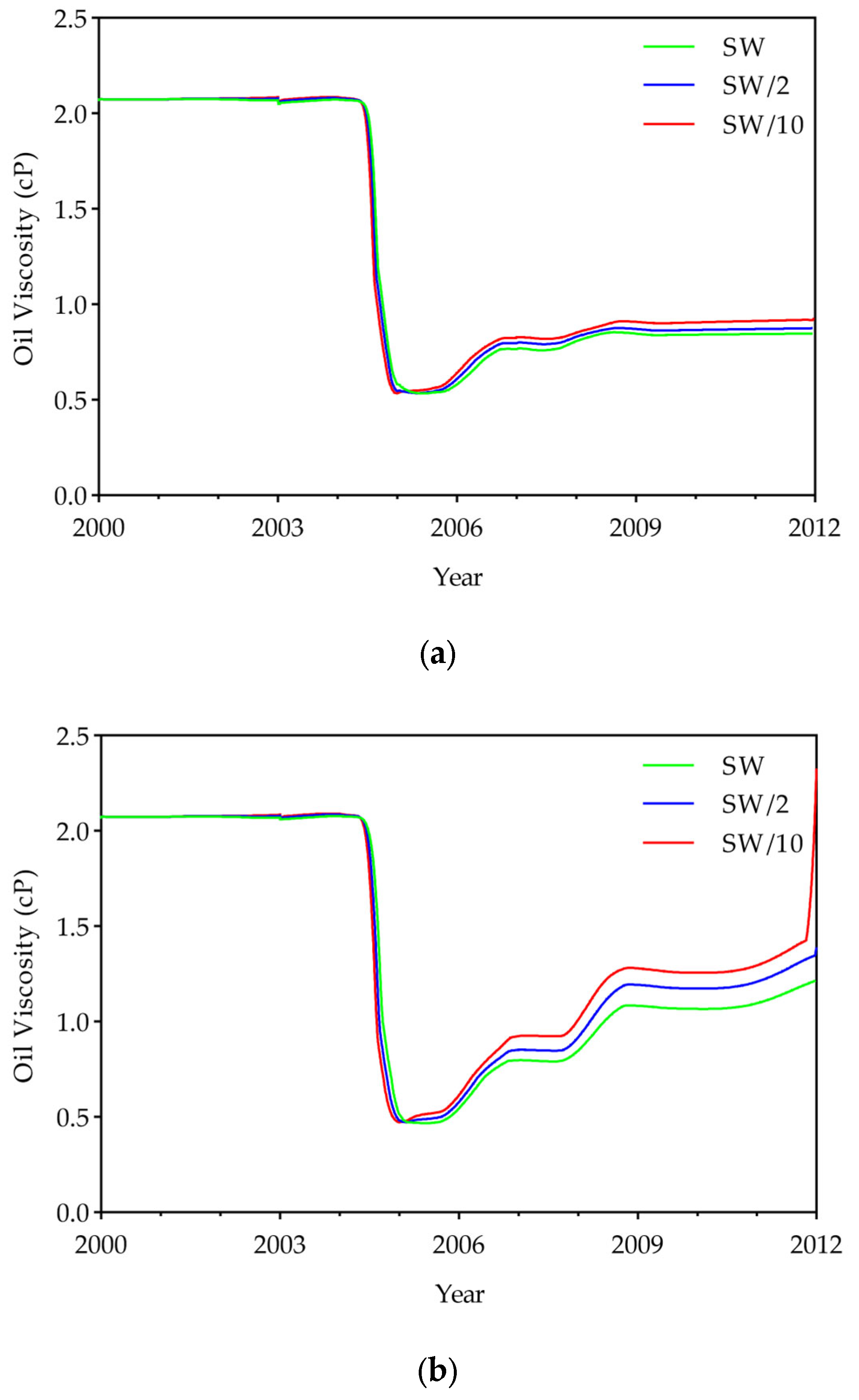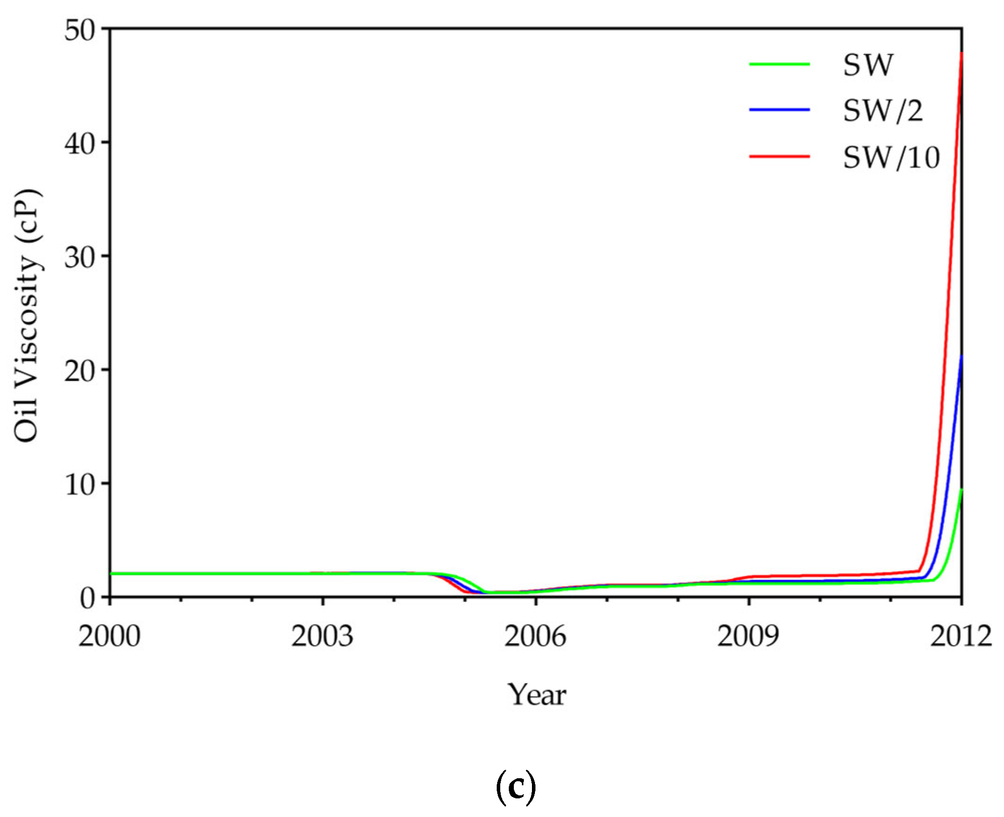 The effects of DME content and LSW on sweep efficiency were investigated through simulations using a 2D cross-sectional reservoir model. Figure 6 illustrates the oil viscosity observed with three brines when 0.25 PV of gas was injected. The slope at the front of the swept zone varied depending on the presence of DME and water salinity, with the slope changing significantly with the DME concentration. In the 0% DME case, the slope was 2.4 for all water salinities. In the 10% DME case, the slope was 4, 4.3, and 6 for SW, SW/2, and SW/10, respectively. In the 25% DME case, the slope was 6, 10, and 14 for SW, SW/2, and SW/10, respectively, becoming steeper as water salinity decreased. Table 8 shows the breakthrough date and swept area for all cases. As DME concentration increased, the breakthrough date was delayed, and a larger area was swept. Compared with the 0% DME case, the swept area increased by an average of 4.9% and 8.1% for 10% and 25% DME, respectively. However, variations with water salinity were relatively small. The breakthrough date was delayed as salinity decreased, but the difference was not significant. The change in swept area with varying water salinity was also negligible. For all DME concentrations, the swept area expanded by approximately 0.2% and 0.8% compared with SW for SW/2 and SW/10, respectively.