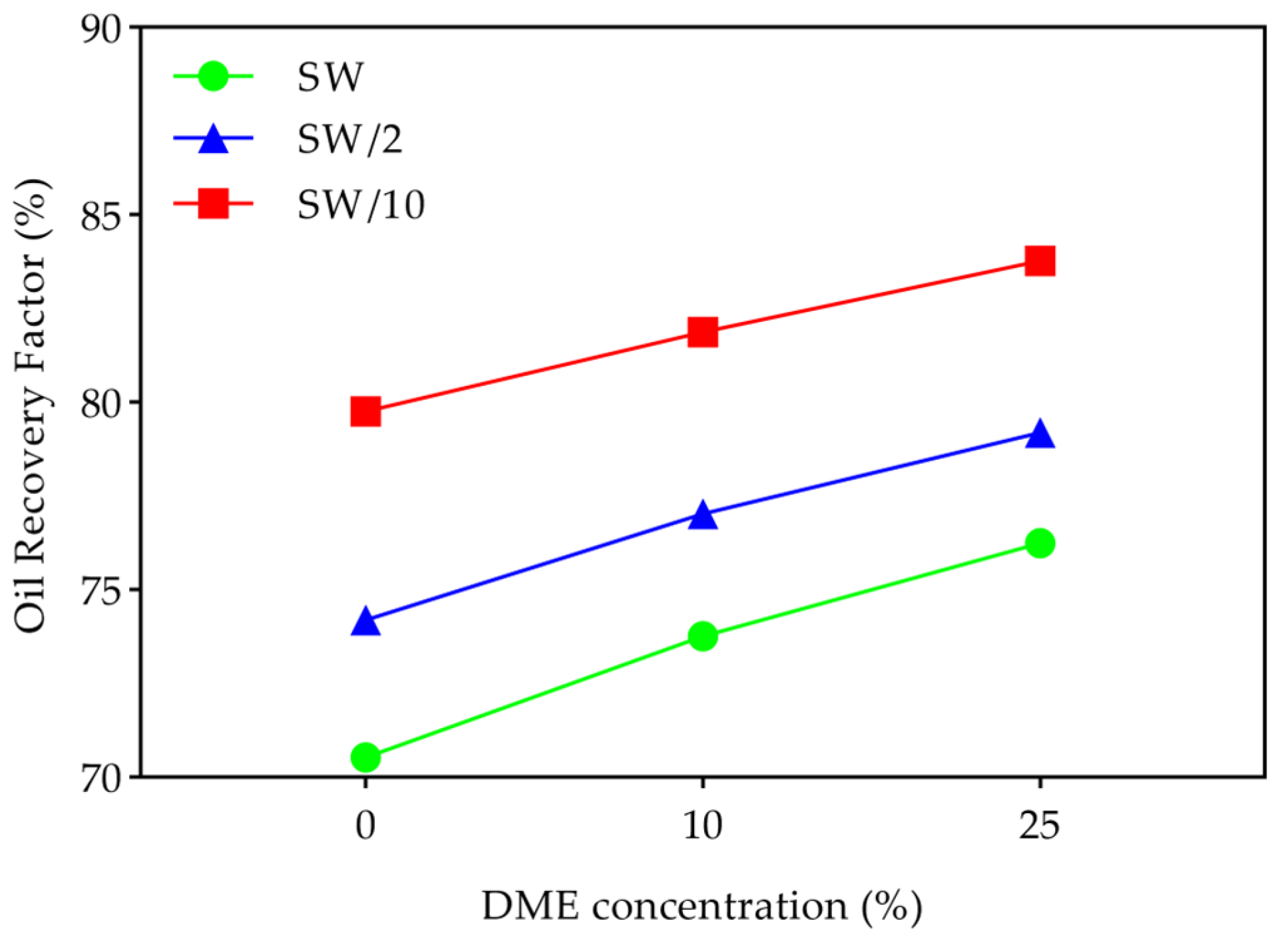 Figure 9 displays the ultimate oil recovery factors for all cases. Within each brine group, the most significant improvement according to DME was observed in high-salinity waters. Compared with the 0% DME case, recoveries in the 10% DME cases increased by 4.6%, 3.8%, and 2.7% for SW, SW/2, and SW/10, respectively, and by 8.1%, 6.7%, and 5.0% for the 25% DME case, respectively. Within each DME concentration group, improved recovery with lower salinity water was observed. Compared with SW, recoveries in SW/2 increased by 5.2%, 4.4%, and 3.9% for the 0%, 10%, and 25% DME cases, respectively, and by 13.1%, 11.0%, and 9.9% for SW/10, respectively. The oil recovery improvement due to DME was highest in the SW injection case. This is because, as water salinity increases, DME becomes less soluble in water and more soluble in oil due to the salting-out effect. These results confirm that DME reduces the effectiveness of LSW. DME, a low-polarity, aprotic organic solvent, selectively associates with water upon contact with brine, separating salt and water [30]. Therefore, the higher the salinity, the more salt remains in the aqueous phase after contact with DME, resulting in lower performance than conventional LSW. For this reason, the oil recovery improvement due to LSW was highest when only CO2 was injected. Overall, these results confirm that the effect of DME was greater in waters with higher salinity, while the effect of LSW was greater at lower DME concentrations.