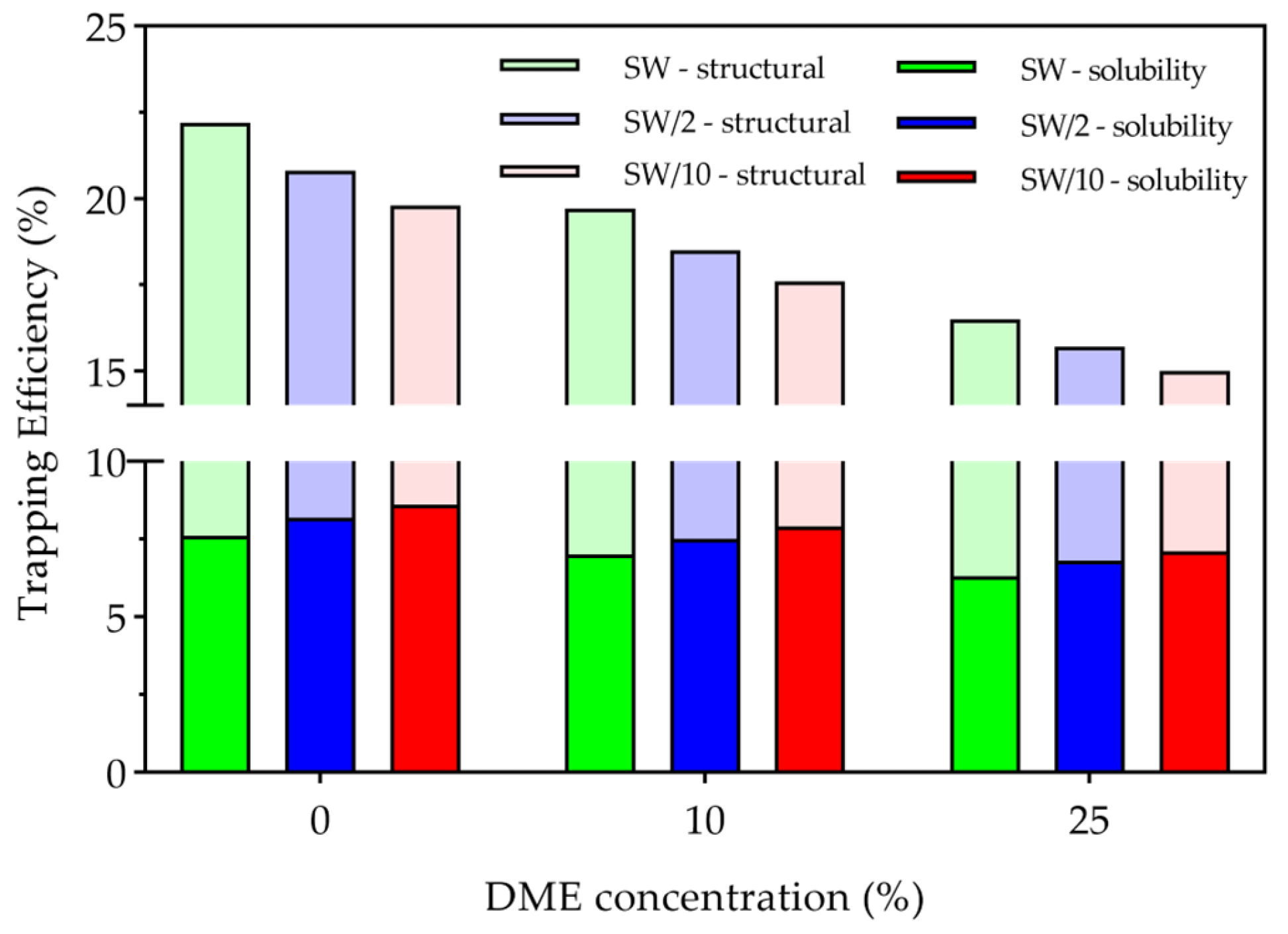 Structural trapping occurs when CO2 within a reservoir is immobilized in a gaseous or supercritical phase. This typically occurs when caprock, faults, or impermeable formation layers surround the reservoir. When CO2 is injected into a reservoir with an impermeable boundary, it displaces existing fluids within the pores and migrates. Depending on the shape and size of the pores, some CO2 is trapped as droplets [31]. As shown in Figure 10, most of the trapped CO2 exists as a structurally trapped supercritical phase. A trend was observed in which the efficiency of this structural trapping increased with higher water salinity and lower DME concentration. The reasons are as follows. First, lower DME concentrations increase the absolute amount of CO2, which increases structural trapping efficiency. Second, as water salinity decreases, the diminished salting-out effect increases CO2 solubility in the aqueous phase. This enhances solubility trapping, reducing the volume of supercritical phase CO2 available for structural trapping. Third, the three years of waterflooding following the WAG cycle displaces structurally trapped CO2. The efficiency of this displacement is enhanced by lower salinity and higher DME concentration, which contributes to a lower final structural trapping efficiency.