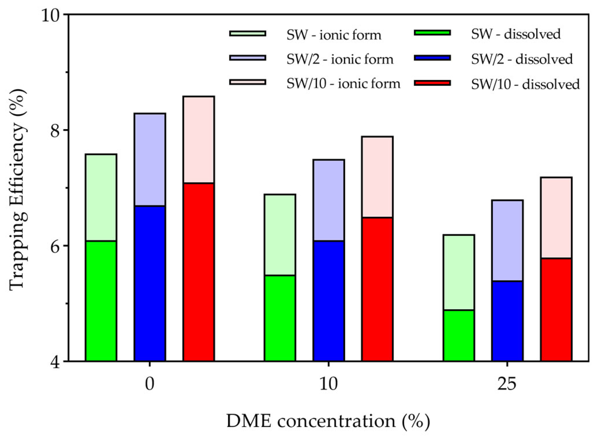 Solubility traps are formed when CO2 dissolves in brine. In this study’s model, solubility was calculated using Henry’s law. When CO2 dissolves in water, it forms weak carbonic acid, which over time decomposes through chemical reactions into H+ and HCO3 ions (Table 1) [31]. Figure 11 displays solubility trapping efficiency for each phase. Because trapping in the ionic form is a very slow process [31], the trapping efficiency in this study was insignificant, at 1.3–1.4%. However, the amount of CO2 dissolved in the aqueous phase decreases as DME concentration increases. Trapping of CO2 in the aqueous phase is governed by thermodynamic effects. Thermodynamically, higher DME concentrations lower the partial pressure of CO2, reducing its solubility. This negative effect is counteracted at lower salinities because the reduced salting-out effect increases CO2 solubility in the aqueous phase, and water saturation increases as salinity decreases.